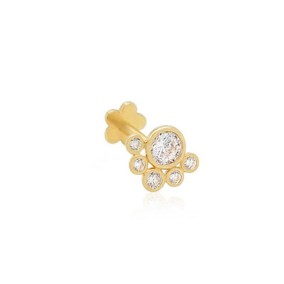 A 2mm bezel set clear cz in 14k gold or white gold with a screw nose post.