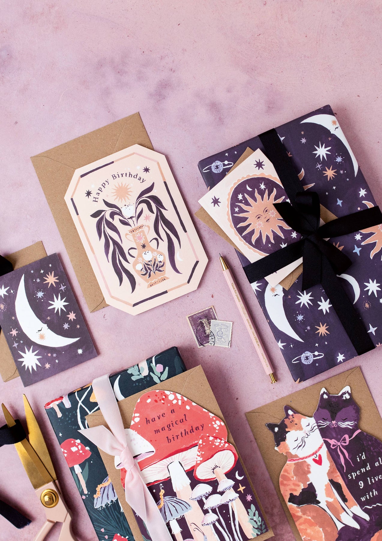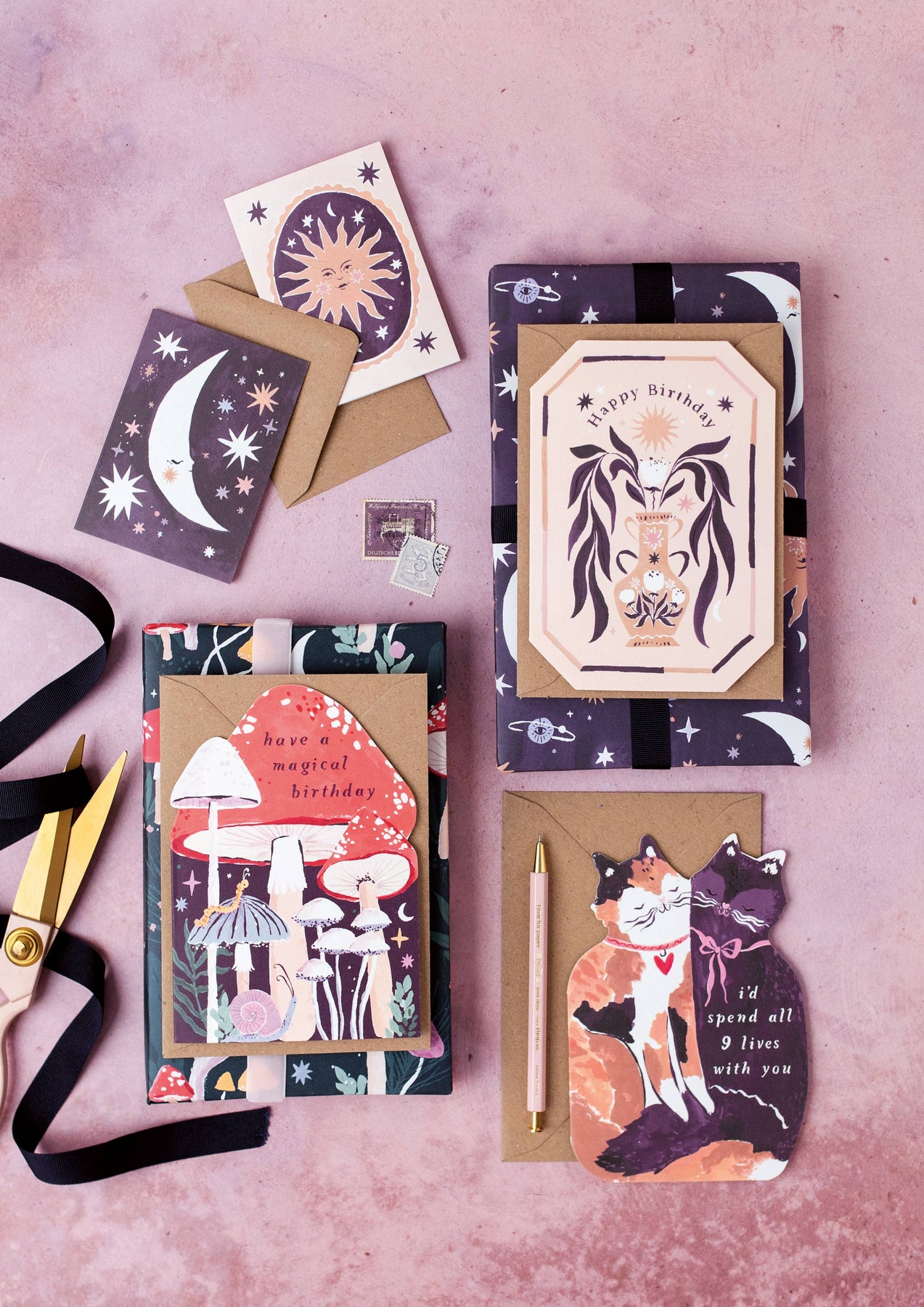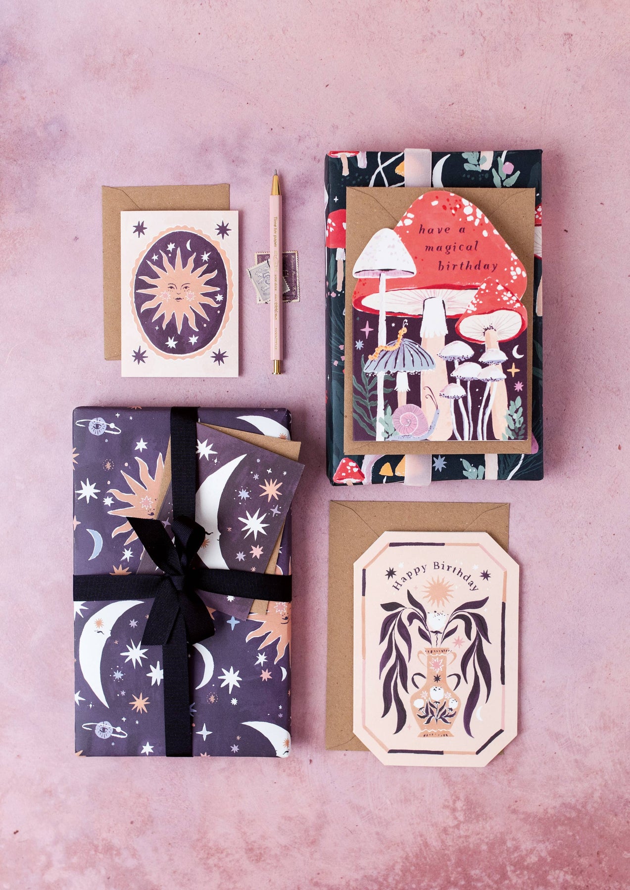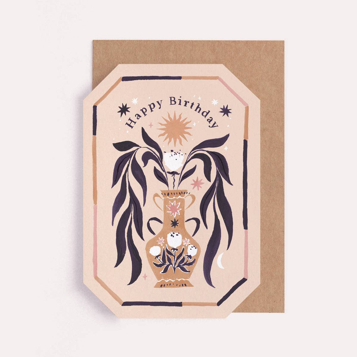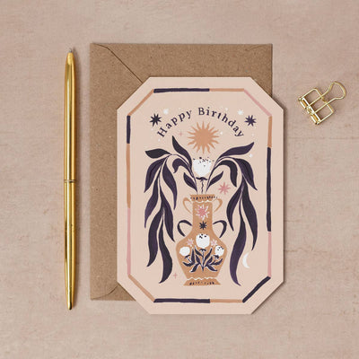 Regular price $ 5.99 Save $ -5.99Lush leafy fronds cascade from the decorated vase in the centre of this birthday card, bordered in a coordinating colourful frame that highlights the card’s unique gem shape. The inside of the birthday card is blank, leaving space for a personal message. Birthday card Unique gem shape 100% recycled kraft envelope Blank inside Luxury, 350gsm card from sustainable forests Illustrated by hand in London Made in the U.K. 100% Recyclable Card Size (WxH): 105 x 150mm / 4 x 6in Packaging options: Biodegradable, clear sleeve or packaging-free with envelope nested inside card. This greeting card is part of the luxury, UK made collection of greetings cards by UK based brand Sister Paper Co. These birthday cards stand out on shelf for their unique gem-shaped die cut shape and hand-painted artwork, all printed onto sustainably sourced card and paired with a 100% recycled paper envelope.