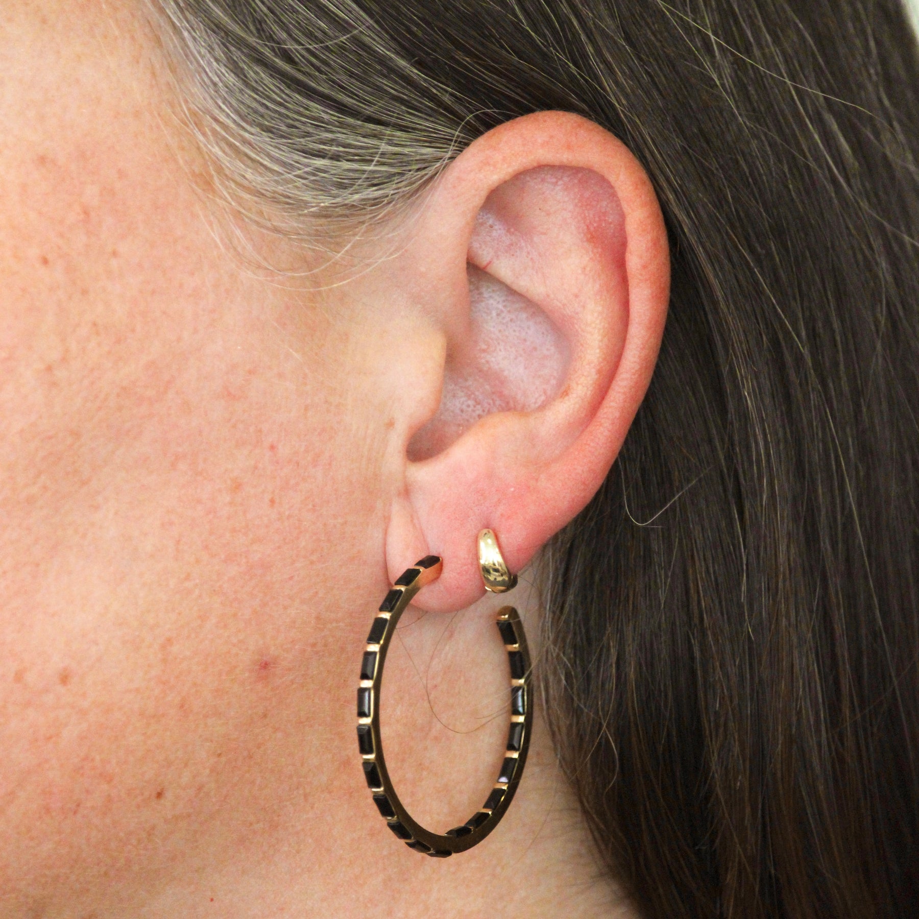 The Point earrings are a two piece earring.  The first piece is the front with either a 14k goldfill dot or bezel set opal stone.  The second piece is the ear jacket in the shape of a small gold plated point.  The point can be worn in the back of the ear or the front, or not at all, giving the earrings three different looks.