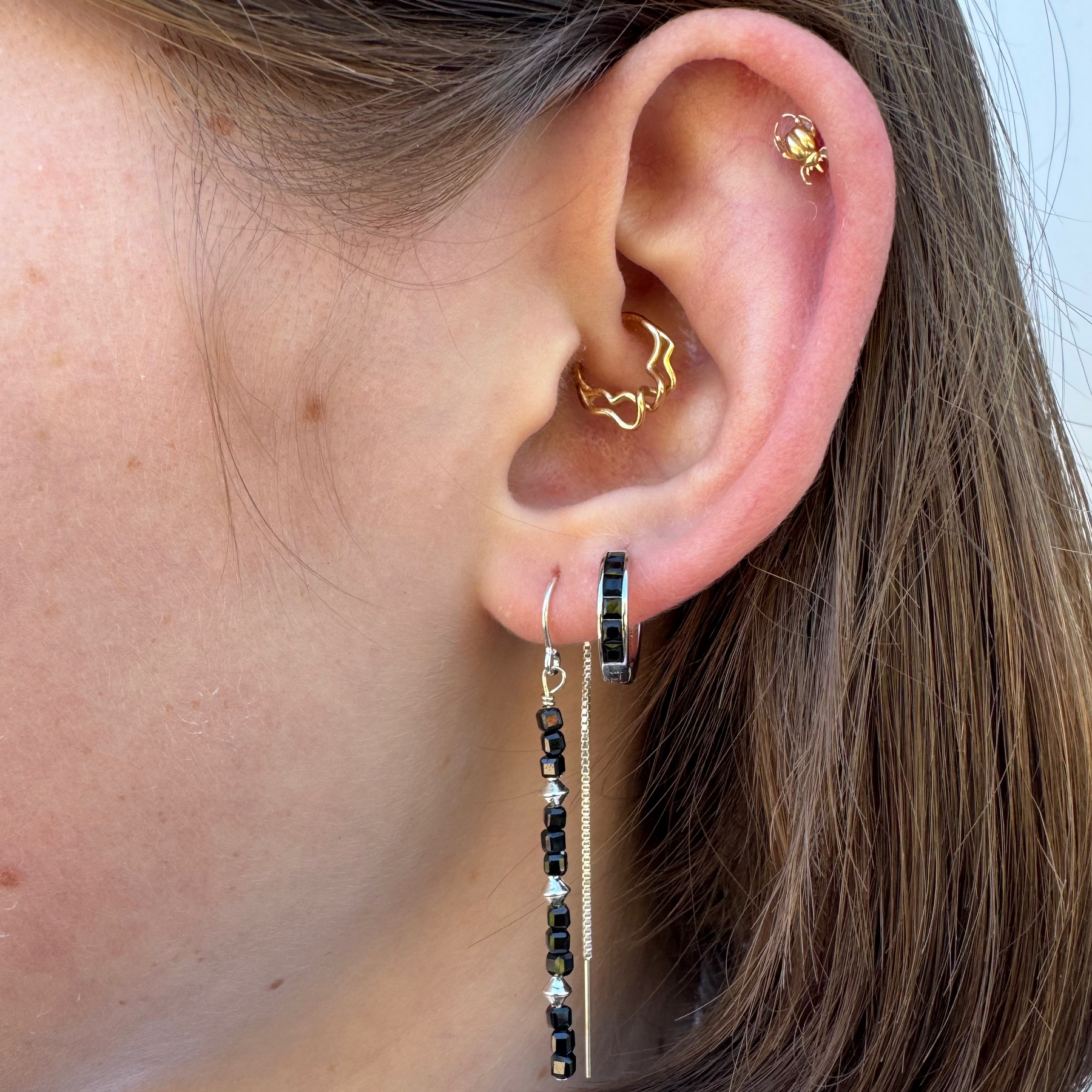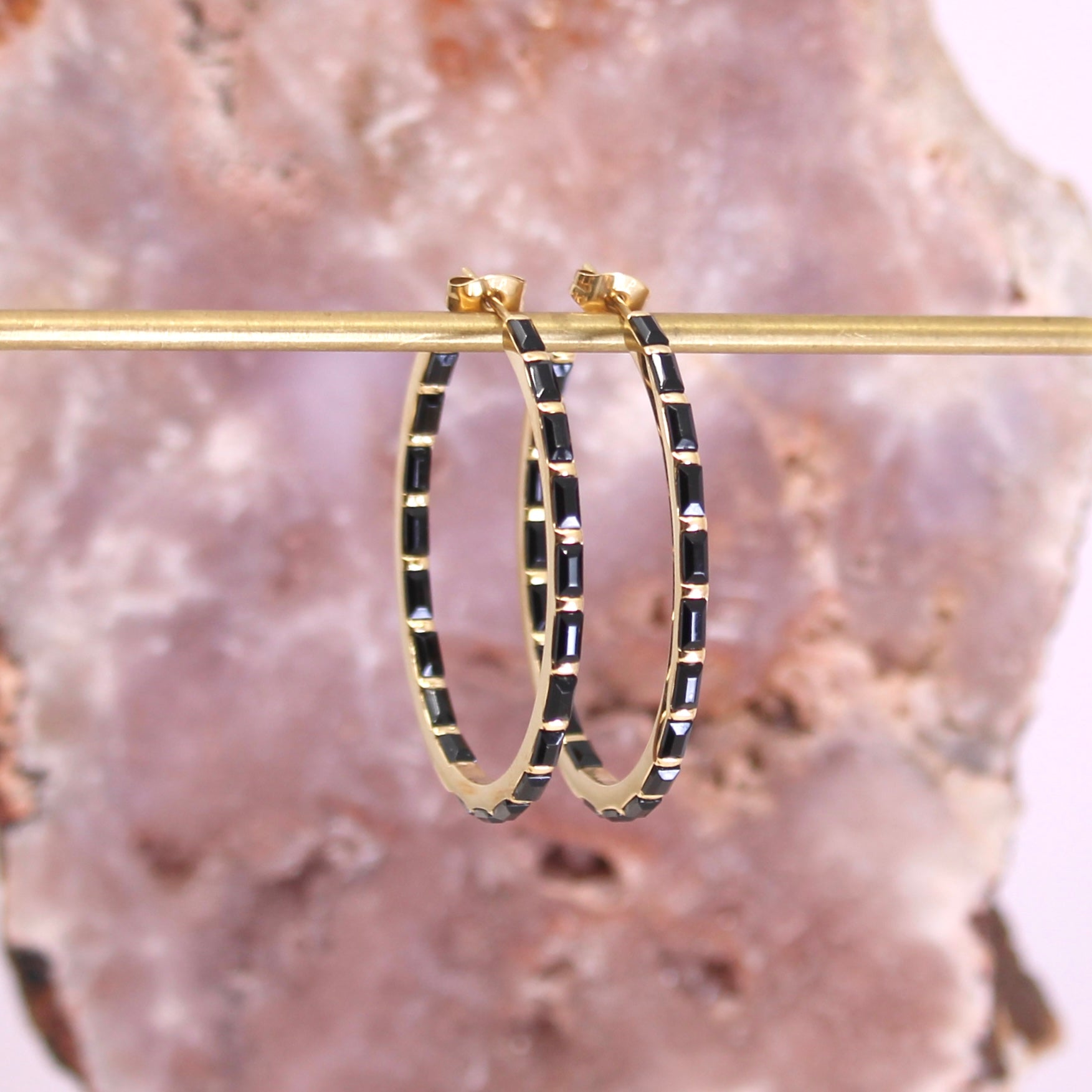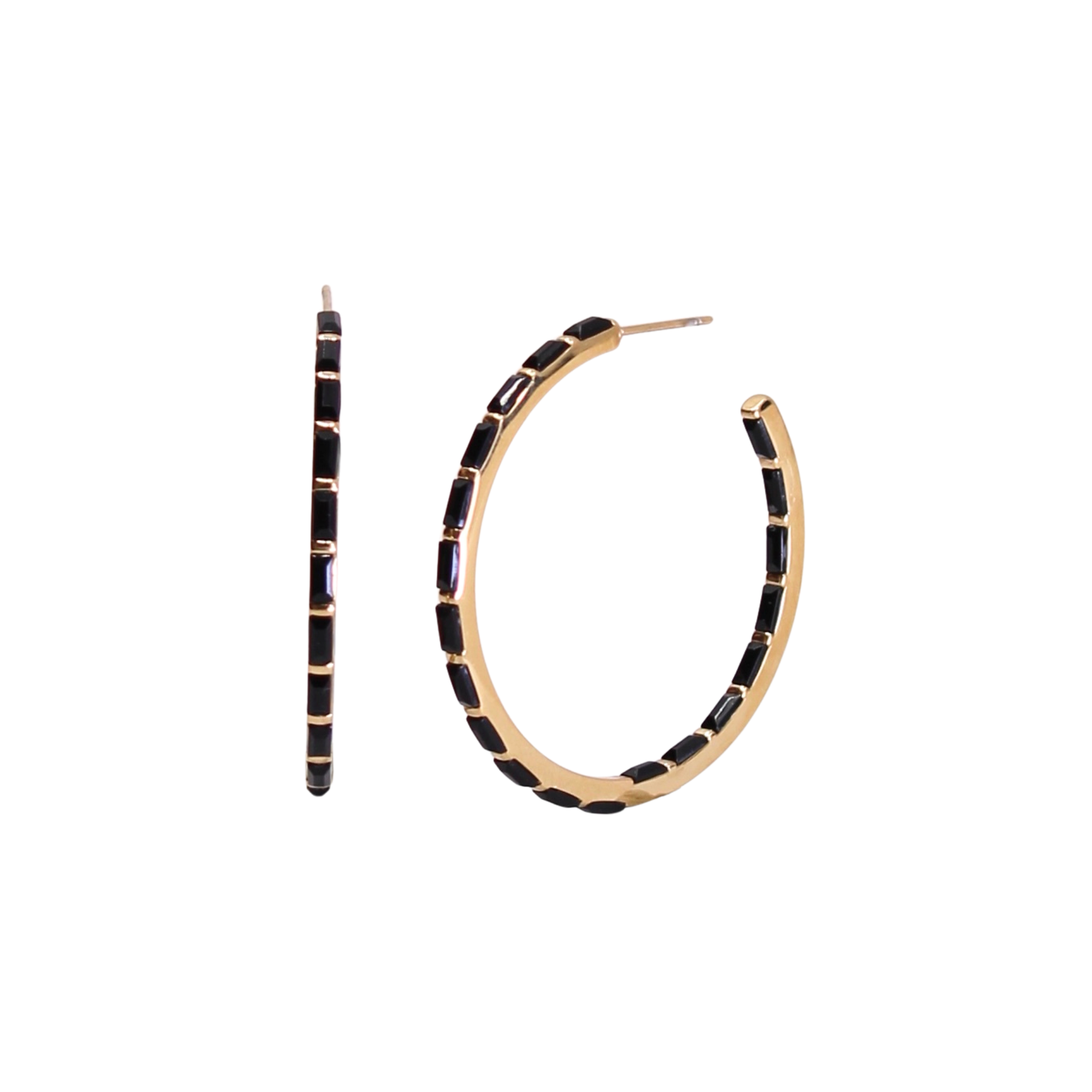 Just like our Orion's Belt hoops, these are the alt-pop big sister. These Midnight Orion Huggie Earrings are the perfect accessory to add an edgy, elegant touch to any everyday look. Crafted with intricate orion detailing, these earrings make a statement that’s sure to get noticed. Featuring 6 black baguette crystals set flush in a 13 mm hoop.
