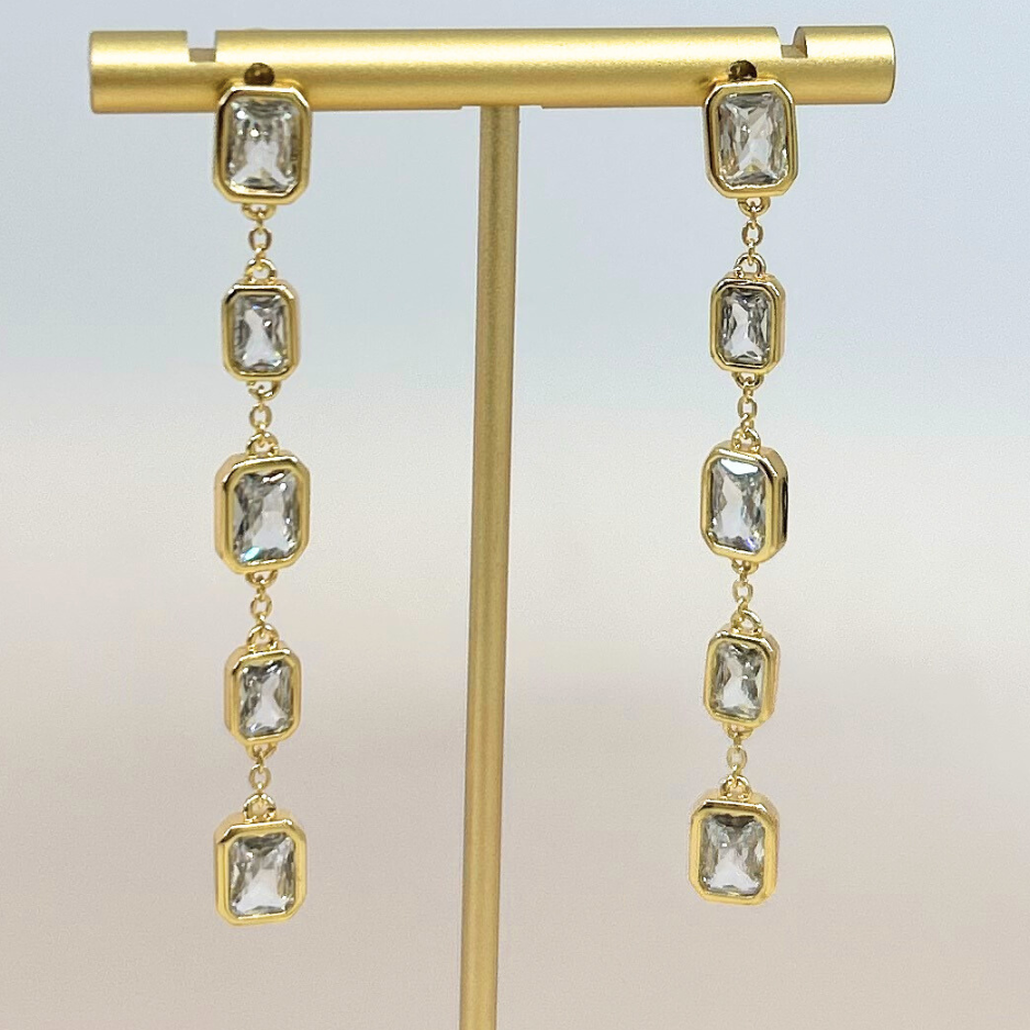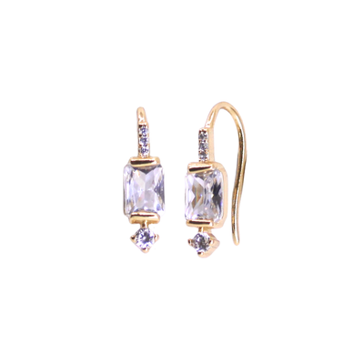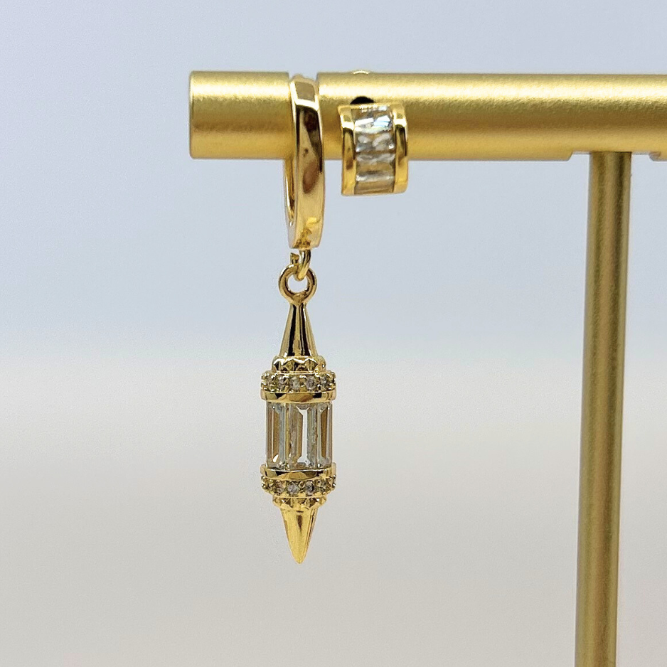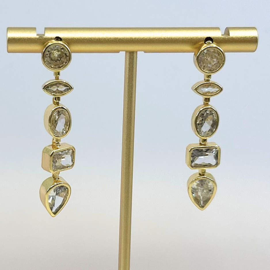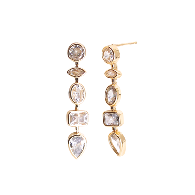 Mineral and Matter's Prometheus Dangle Studs feature a variety of shinning CZ's. Inspired by the Vaisala Comet and its illuminating orbit around the sun, completing it's cycle every 85.4 years. These earring fall into a path of their own with bezeled circle, square, and baguette cubic zirconias. These earrings offer a refined statement that elevates your style with subtle cosmic charm.