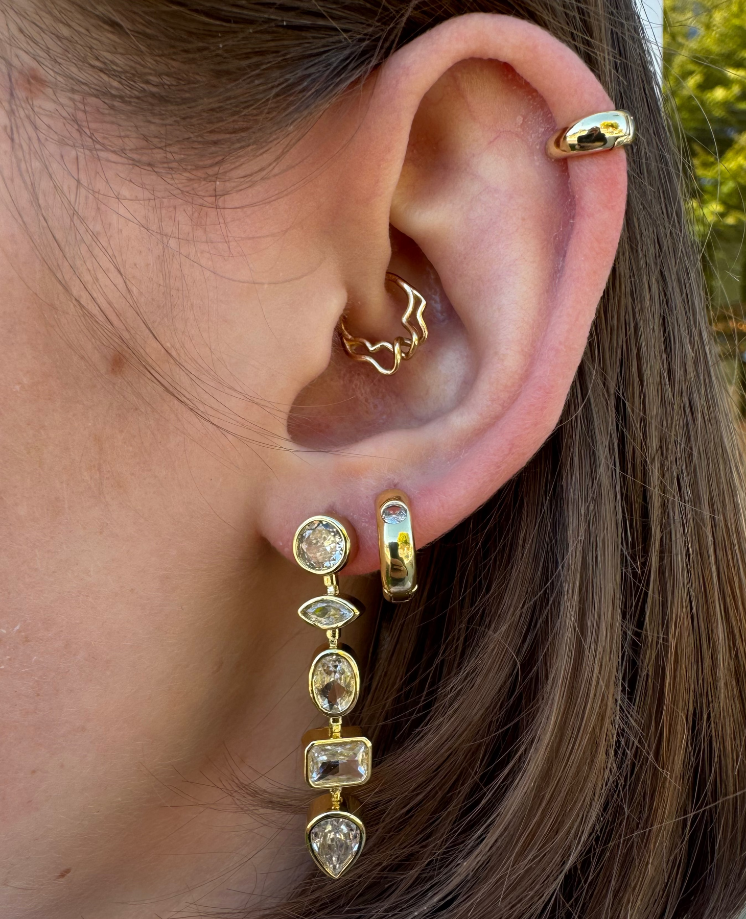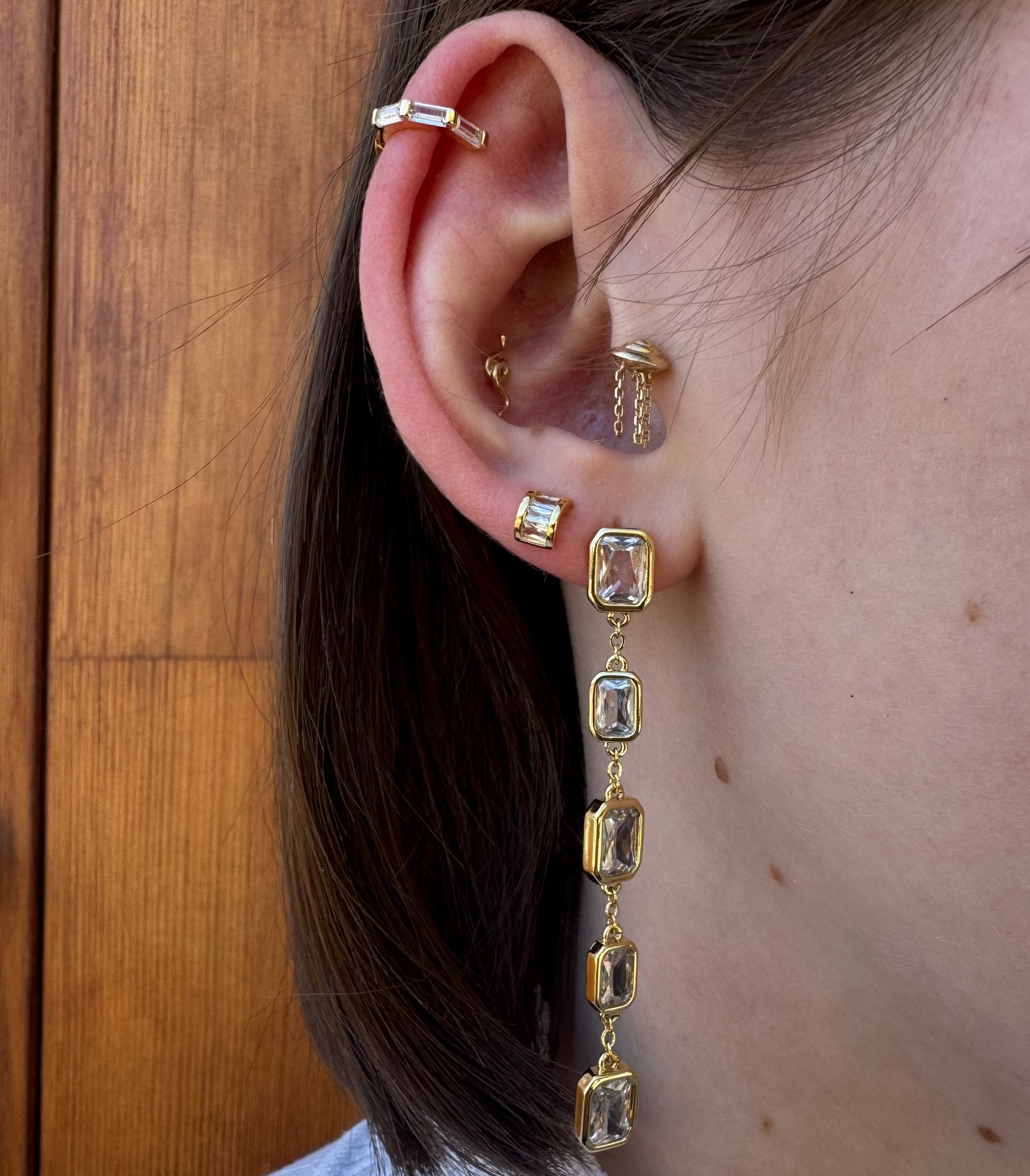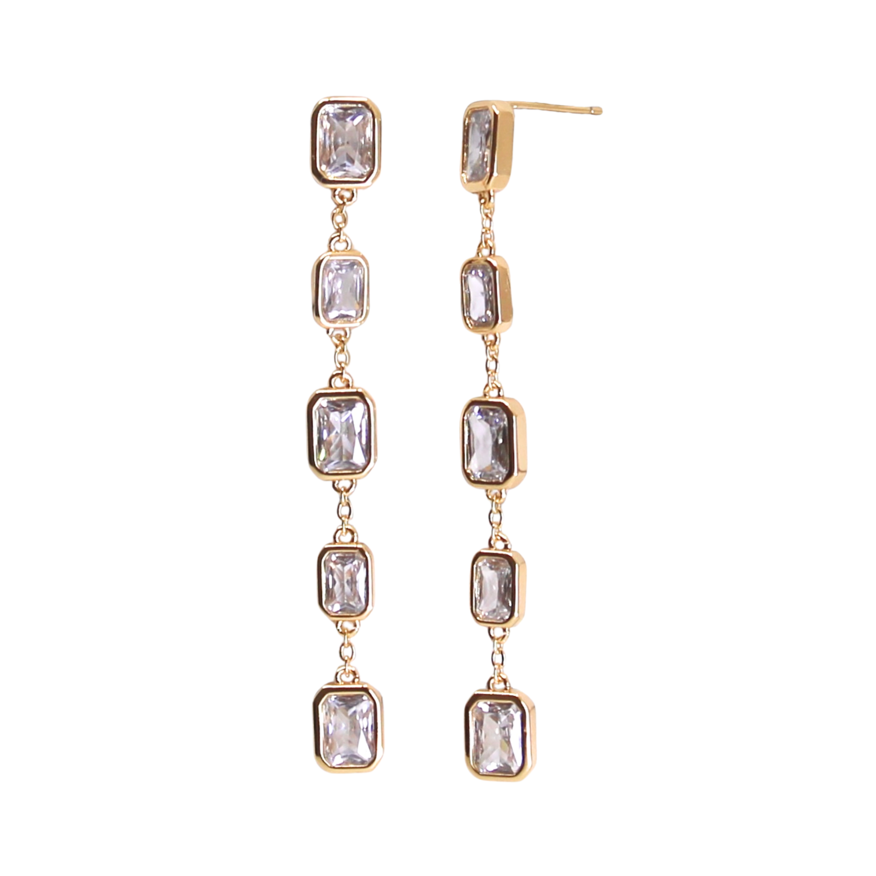 Mineral and Matter's Prometheus Dangle Studs feature a variety of shinning CZ's. Inspired by the Vaisala Comet and its illuminating orbit around the sun, completing it's cycle every 85.4 years. These earring fall into a path of their own with bezeled circle, square, and baguette cubic zirconias. These earrings offer a refined statement that elevates your style with subtle cosmic charm.