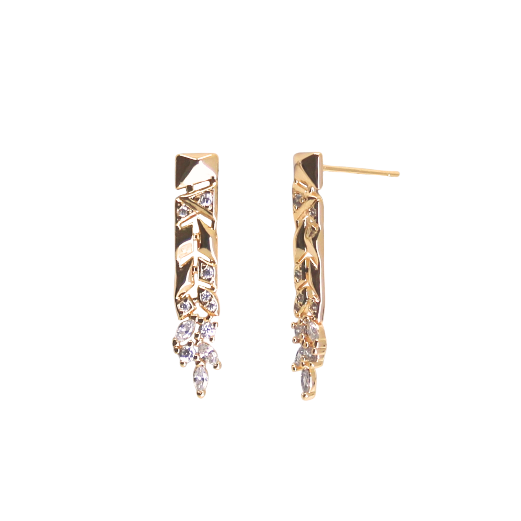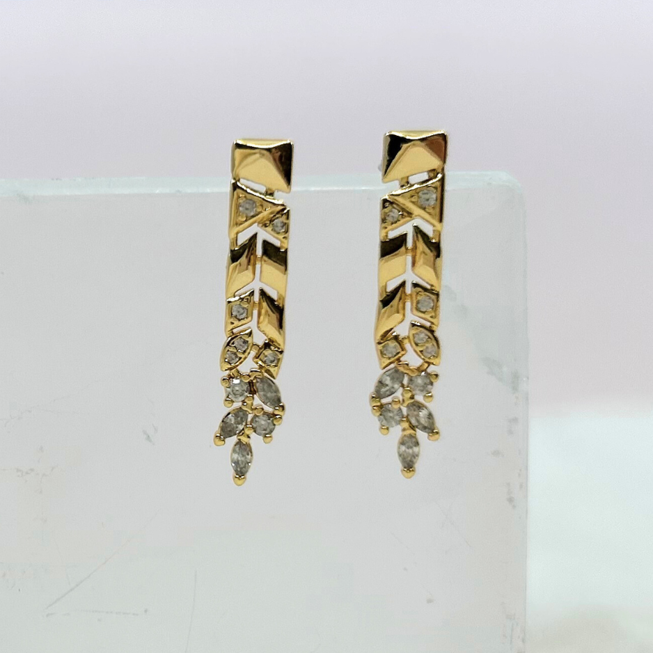Mineral and Matter's Prometheus Dangle Studs feature a geometric braided bar that branches into CZ leafs. These earrings blend geometry, space, and nature, offering a bold accessory for any look. Their patterned captures the dynamical chaos of Saturn's F-ring that is controlled by the Prometheus moon.
