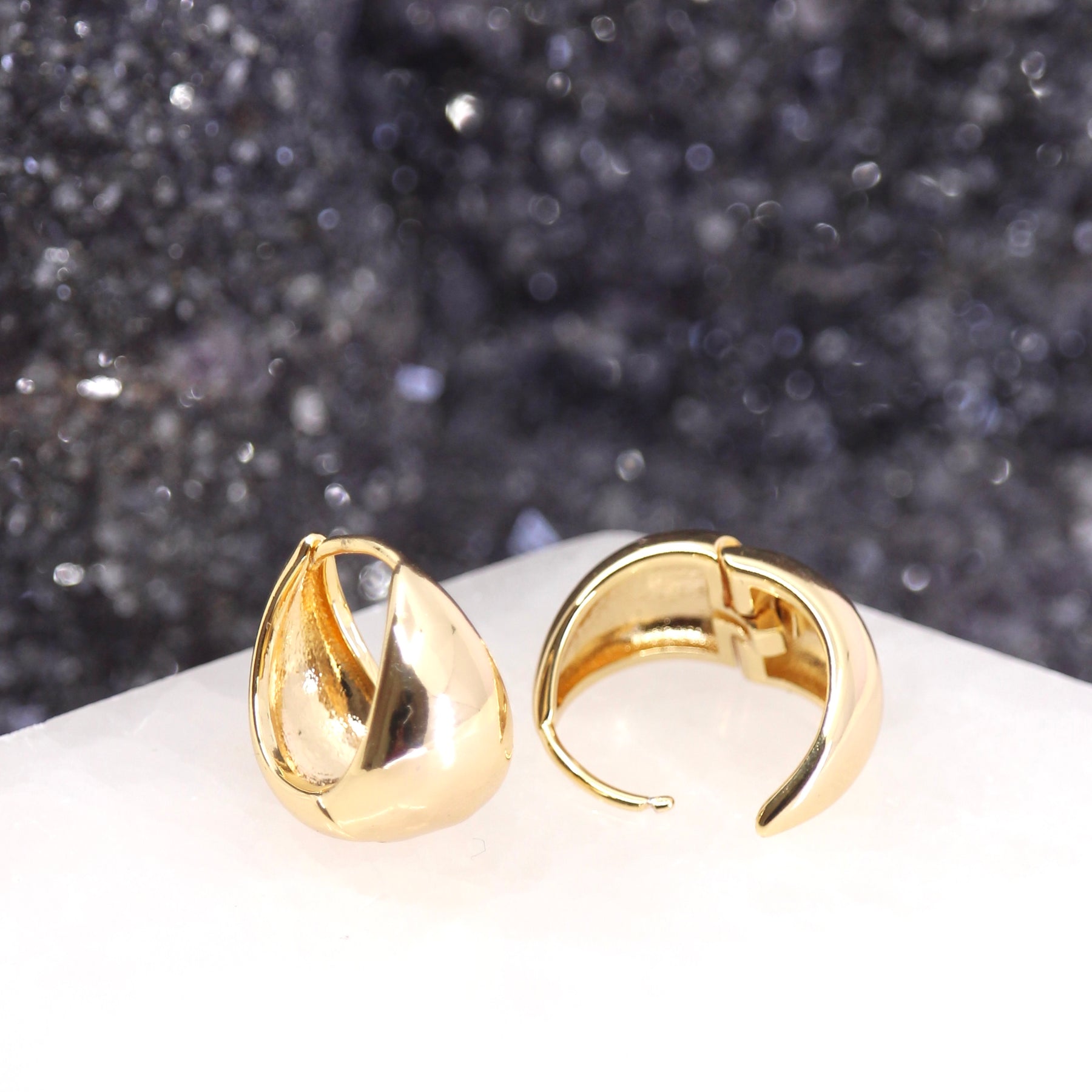 These hoops are named after the galaxy with a rectangular shape. It has a bright shimmering appearance due to the rapid formation of young stars within its center. Shine on with these unique and stunning Leda hoops