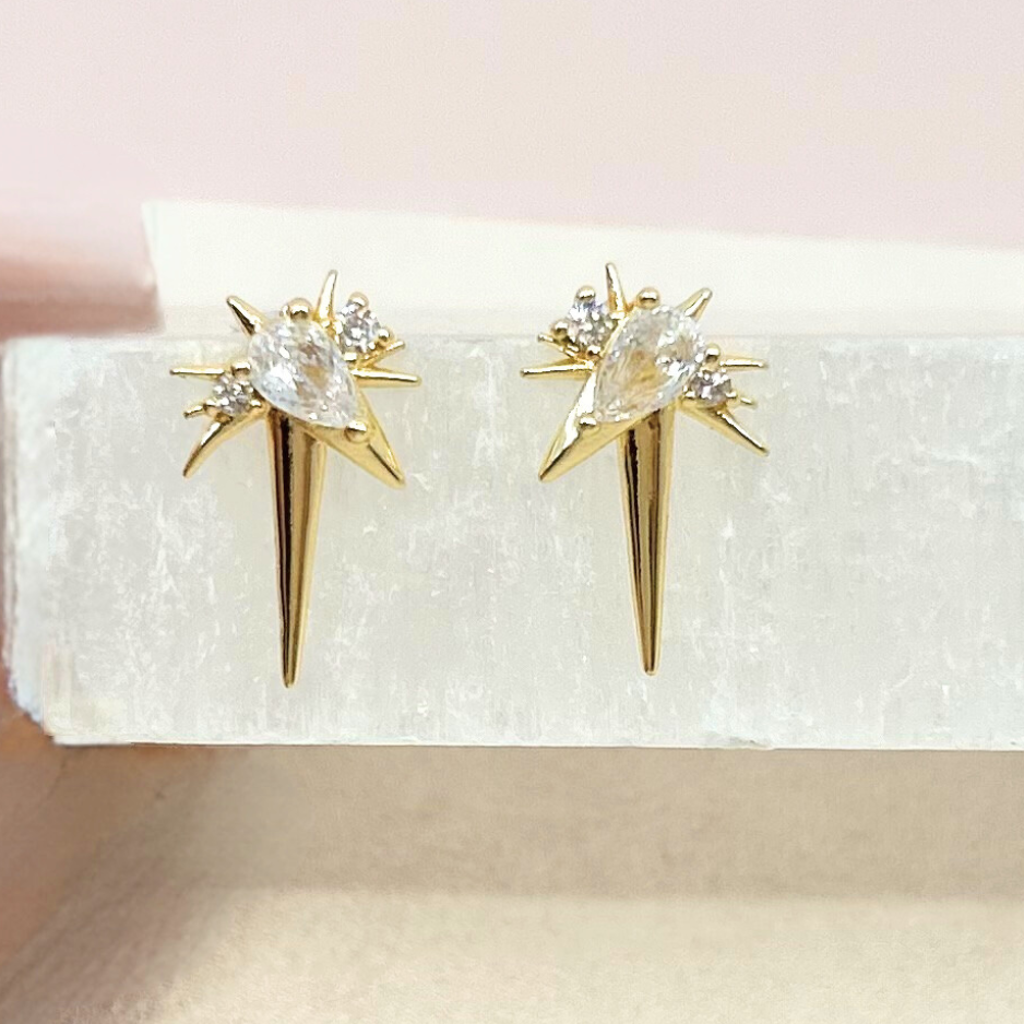 The Mineral and Matter Bolide CZ Dangle Stud Earrings mimic extremely bright bolide meteors that appear 51 times brighter than the full moon in our night sky. These studs shine nearly as bright with three CZ studs and shimmering gold rays, elevating any look.