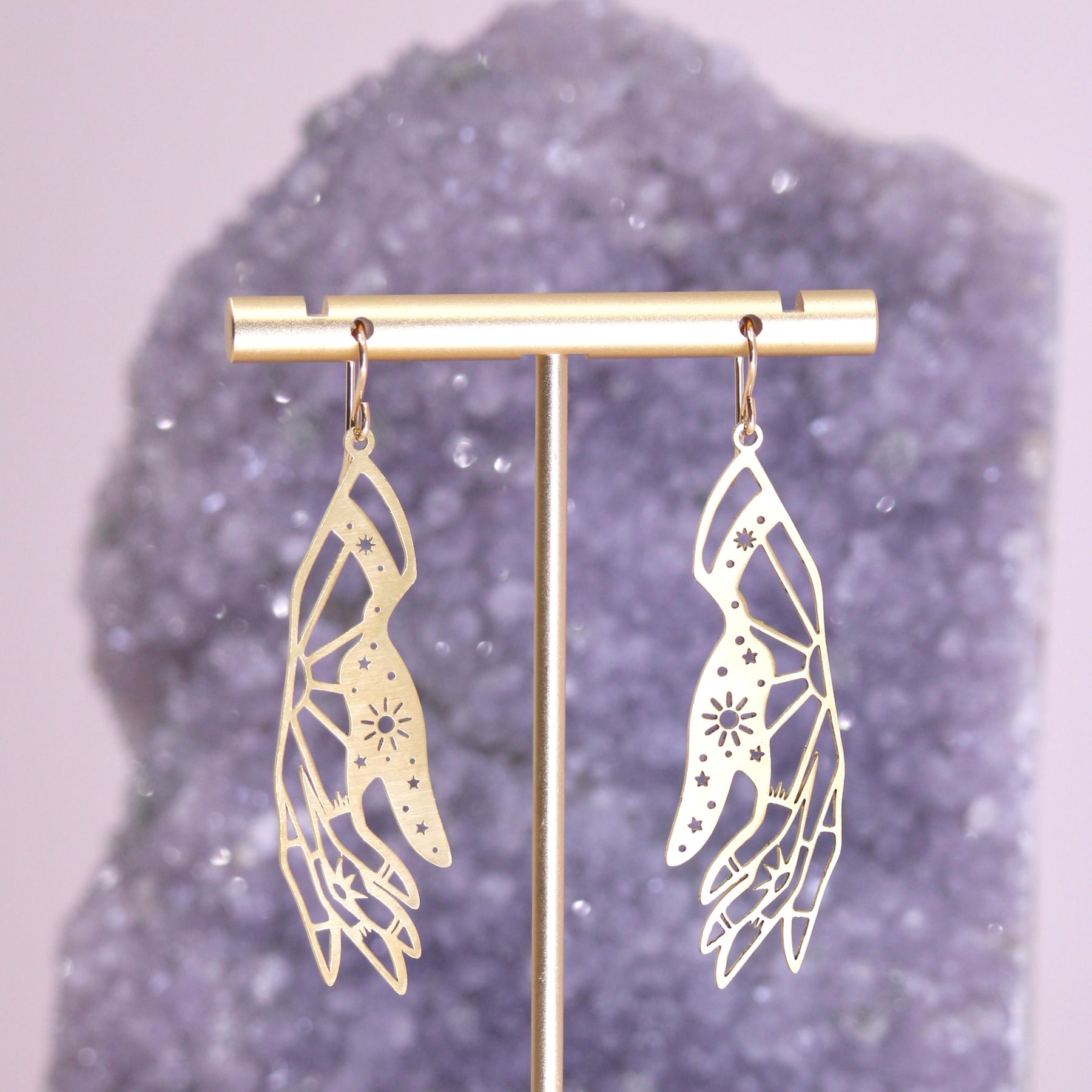 These striking brass earrings showcase an imaginative cosmic narrative—complete with swirling clouds, lightning bolts, and a skull ascending into a UFO. Meticulously crafted through precision laser-cutting, each pair delivers intricate detail without sacrificing wearability. The lightweight construction ensures all-day comfort.