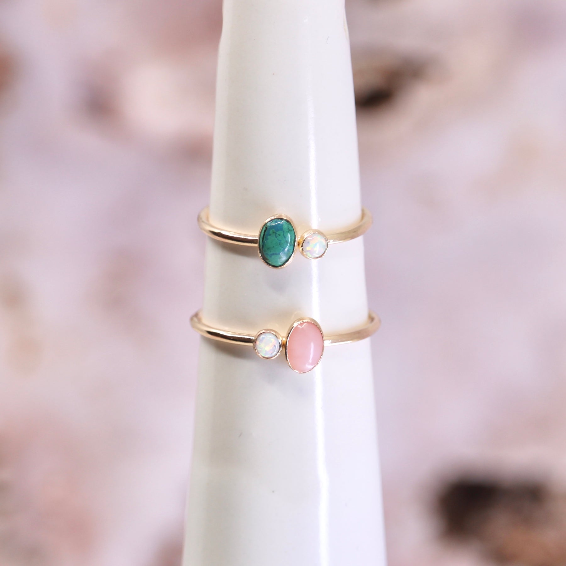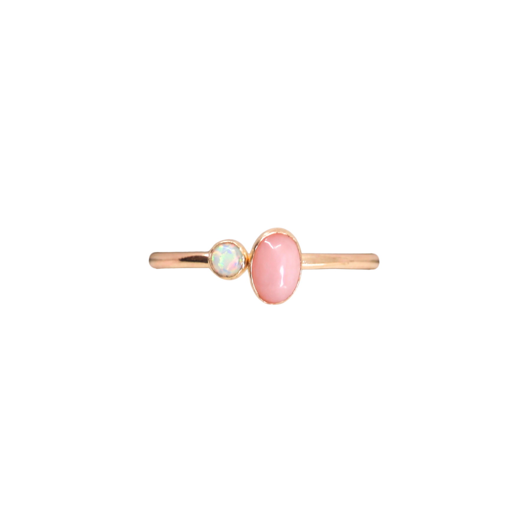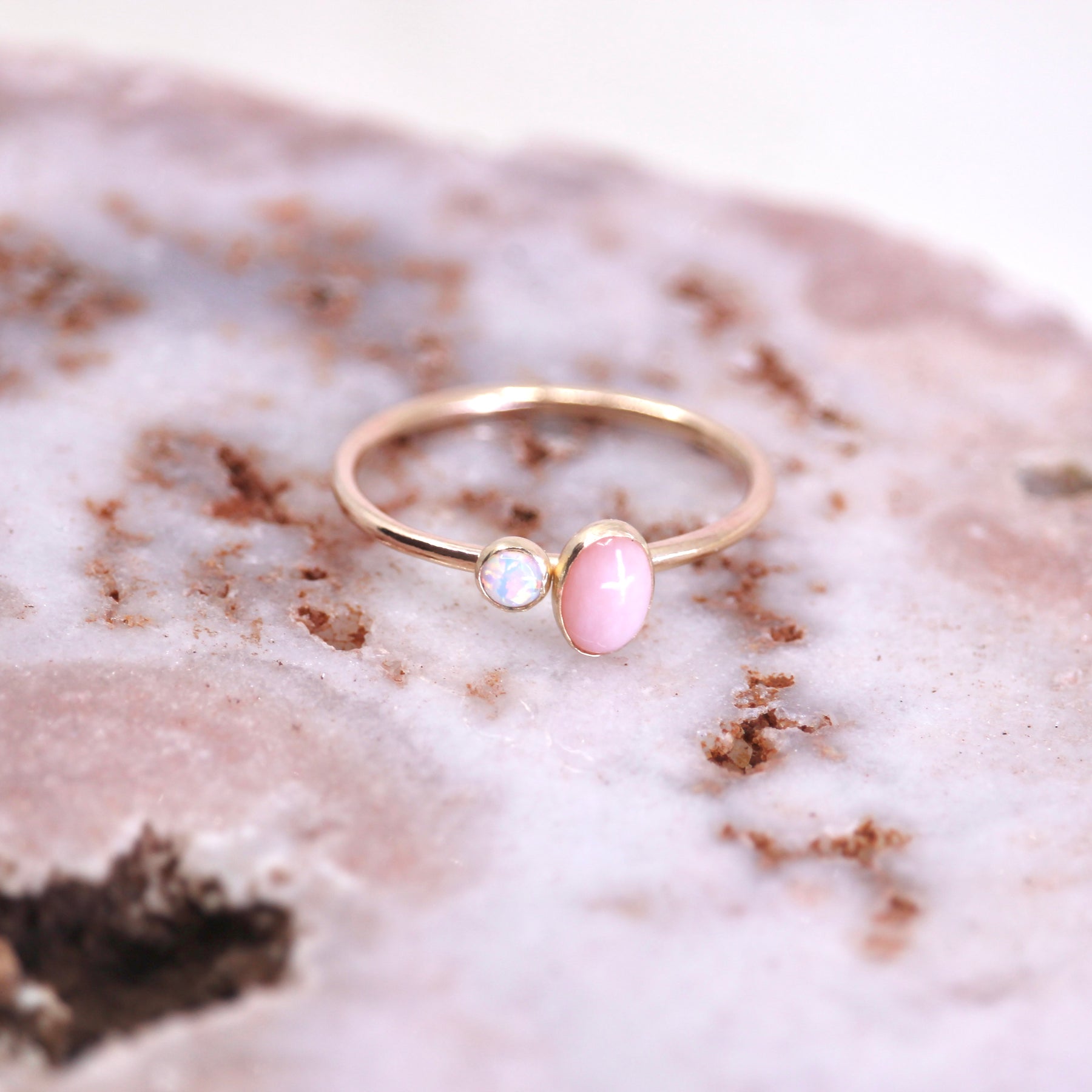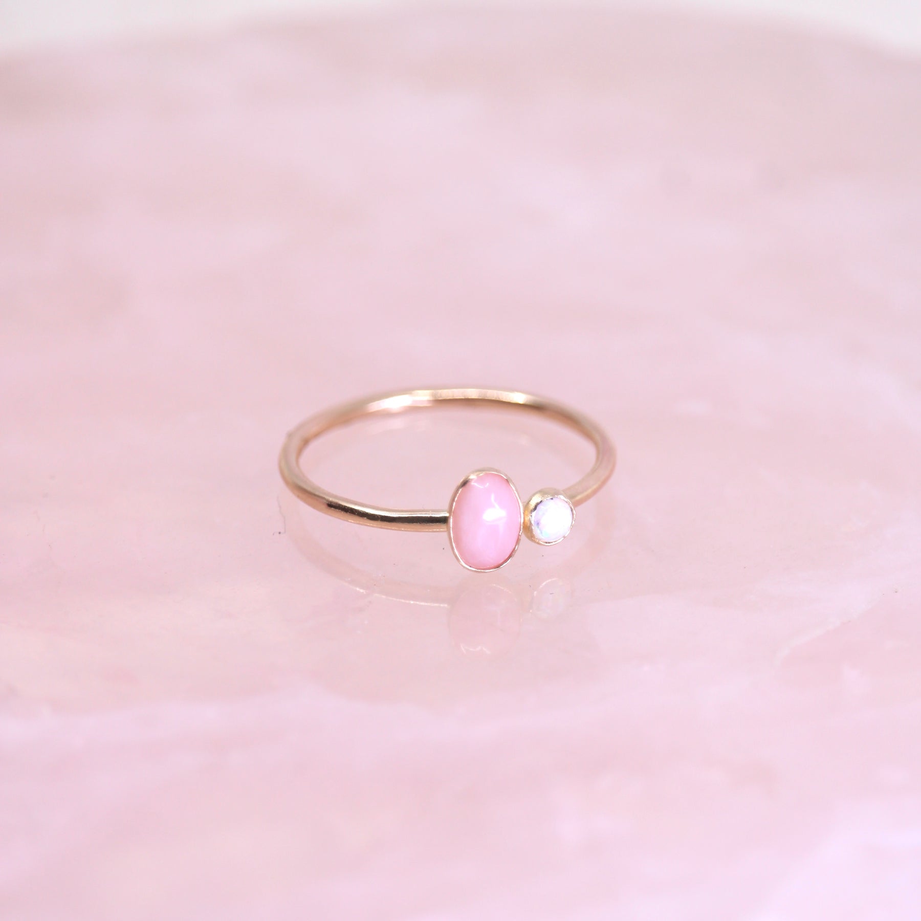 Two stones compliment each other nicely in this ring. An oval shaped pink opal reflects the pink shimmers in a tiny, white opal next to it. Hand-formed, this ring is set in a bezel style in 14k gold fill.