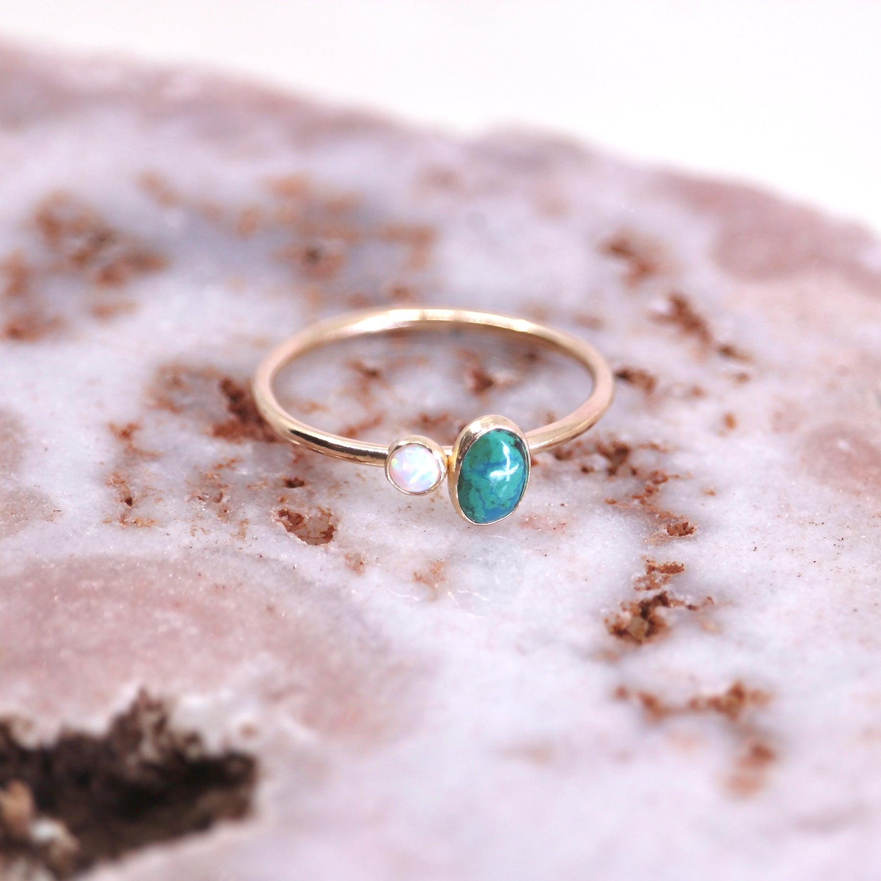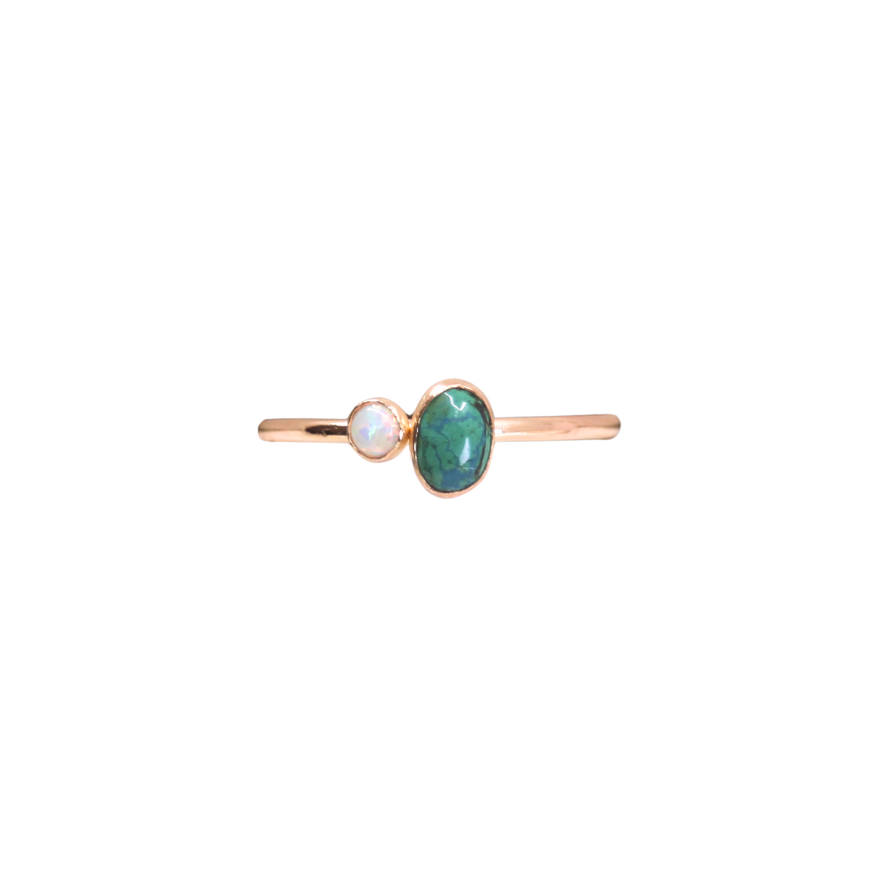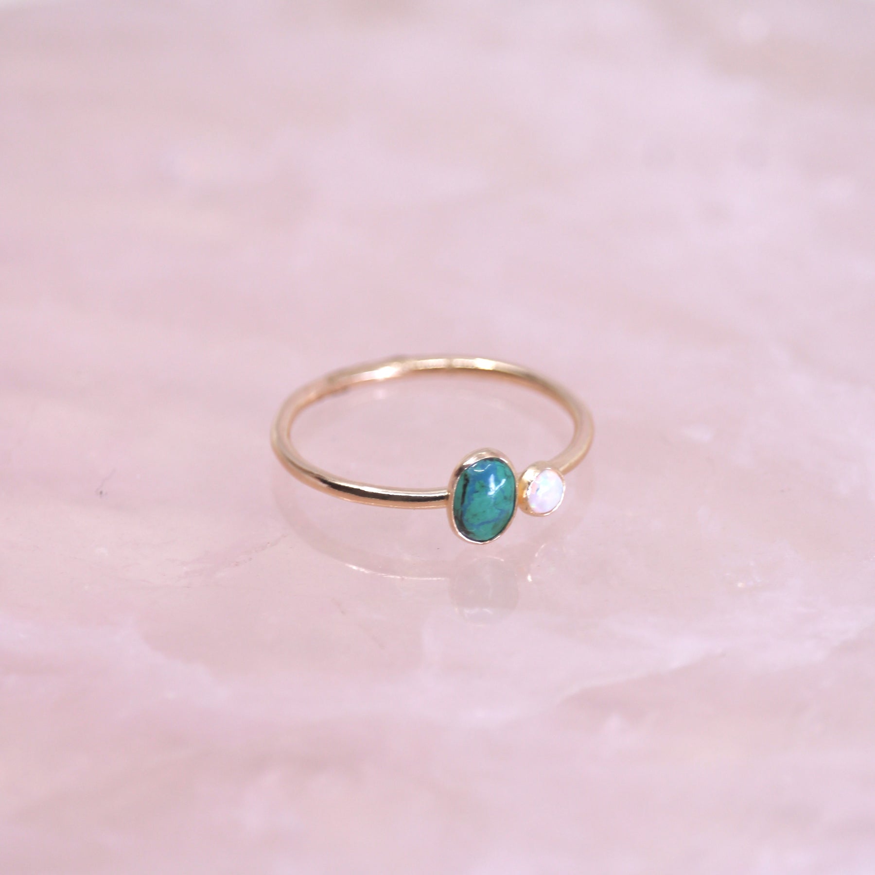 Our Duo Ring series are the perfect rings to add a pop of color to your everyday rotation or a special occasion. This ring features an oval blue-green chrysocolla with an opal complement.