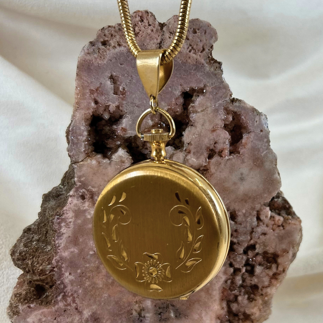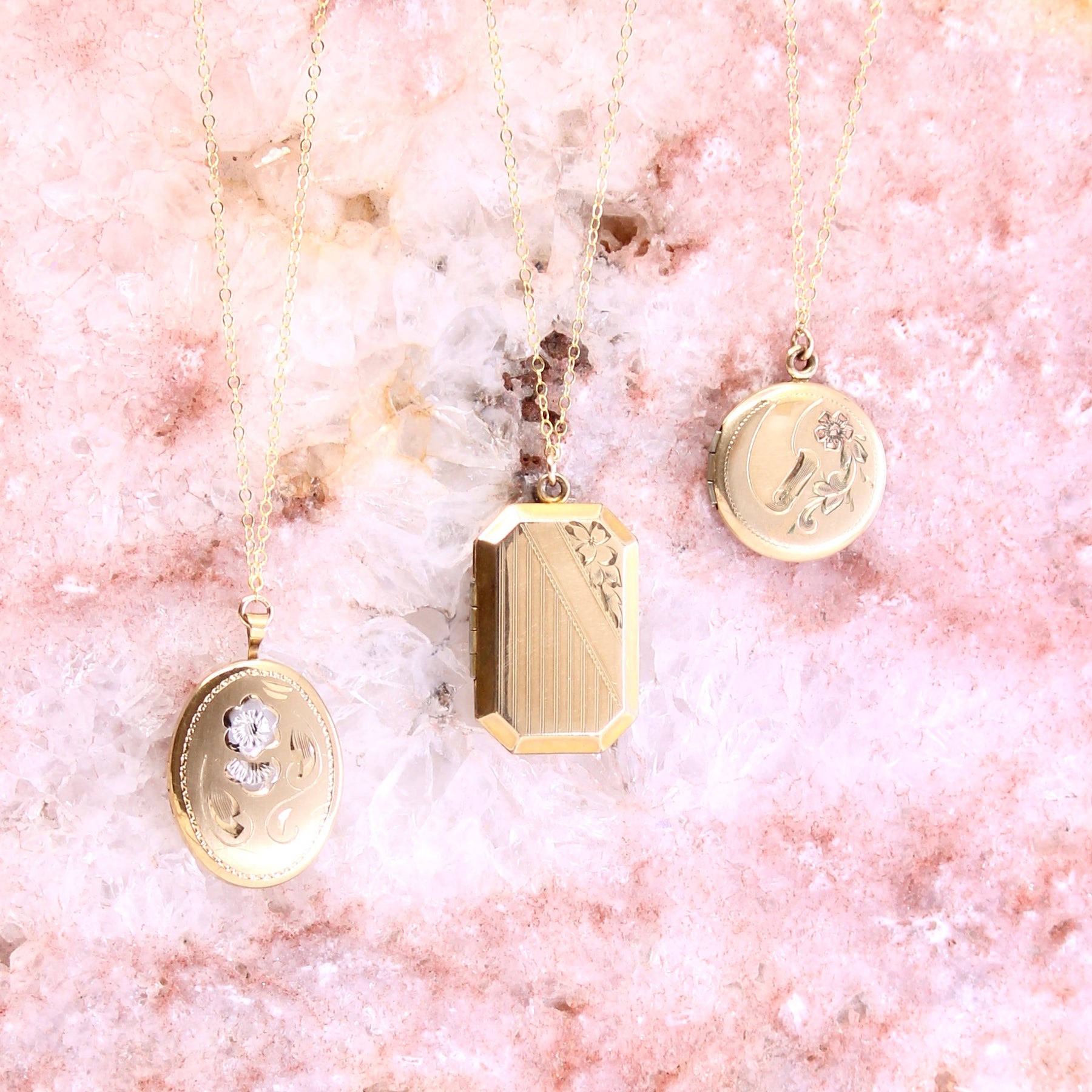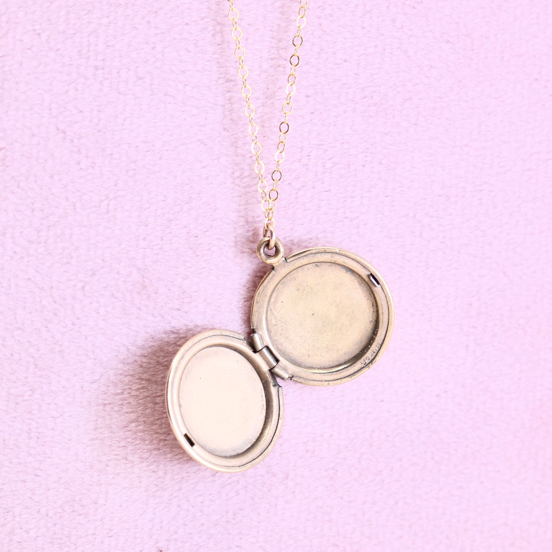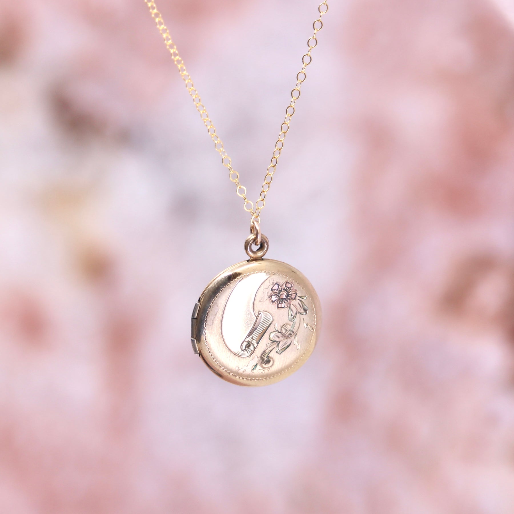 Locket #2 This gold filled locket features beautiful, intricate details. On the front you will find etched detailing with stunning deep stones. Most likely the initials of the original owner, the initials ME engraved into the back this piece in a beautiful flowing font. Inside this locket you will find two places to put your perfect pictures with plastic coverings for each. Estimated to be from the early 1900's -1920's this piece is the perfect gift. This piece comes stung on a brass toned 20" rope chain. The locket measures approximately 1.25" tall by 1.25" wide.