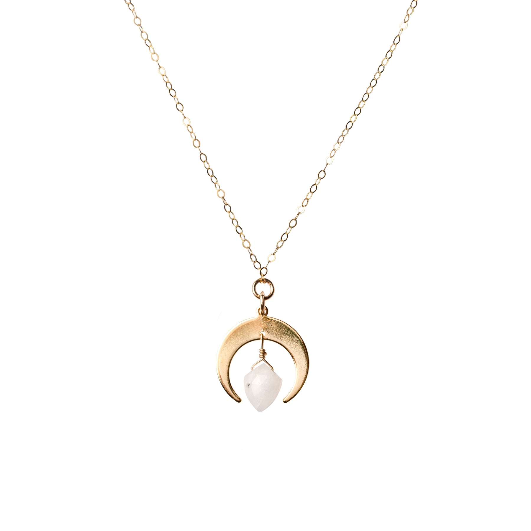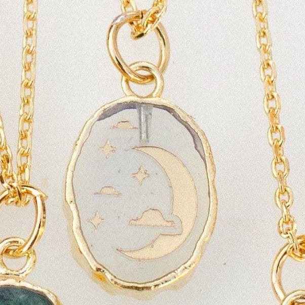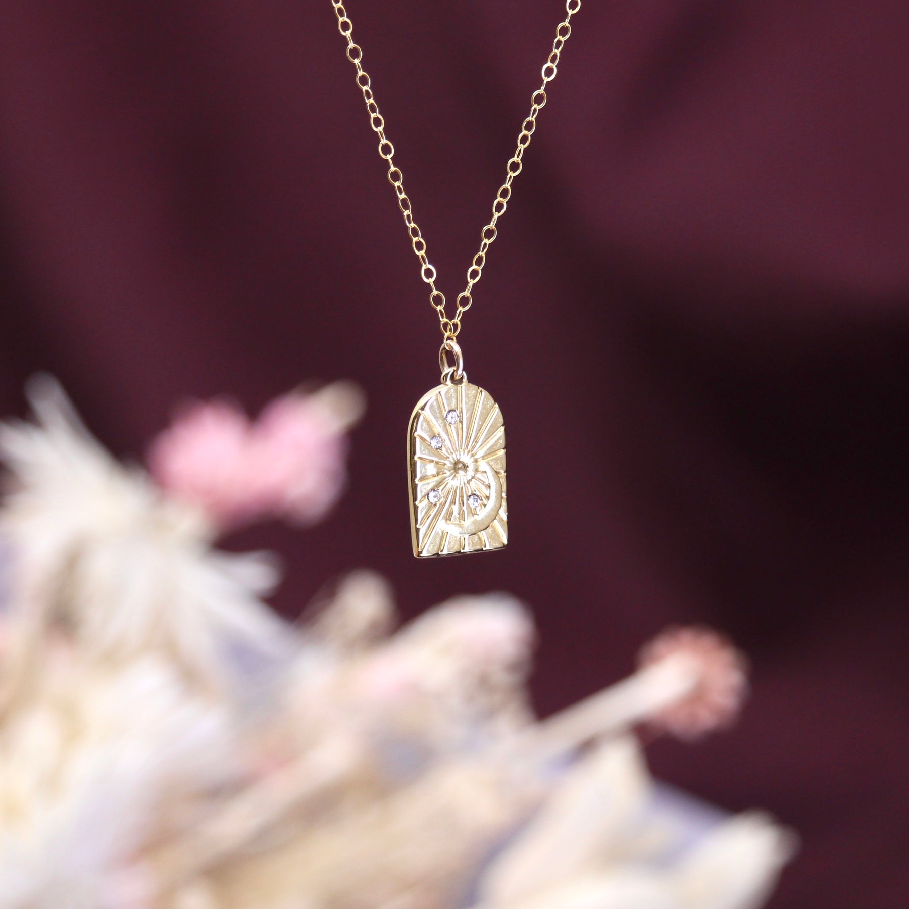 The charm features a crescent moon and cubic zirconia stones overlaid on a sunburst motif within an arch-shaped pendant. The gold plated charm hangs from a perfectly dainty 16" gold filled chain.