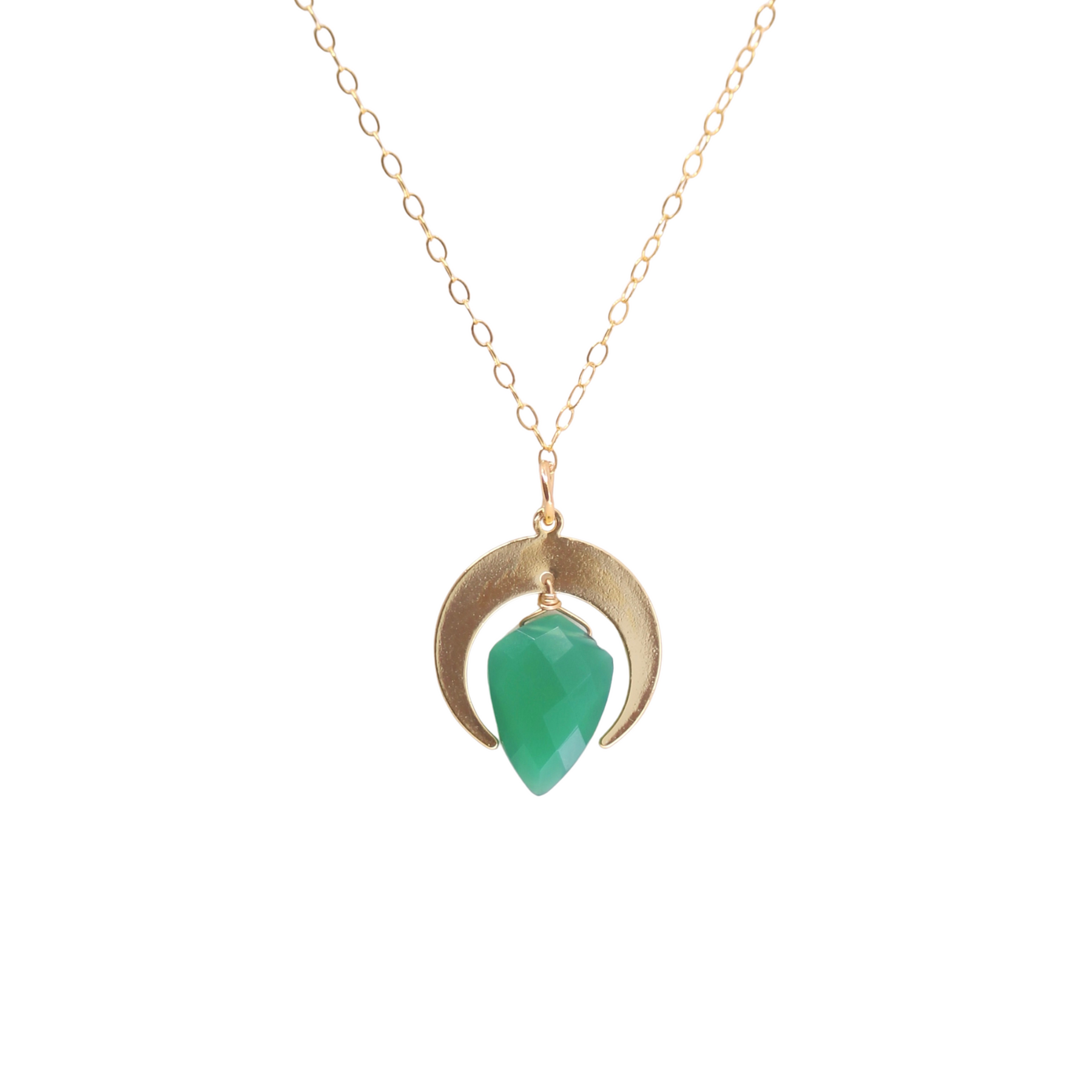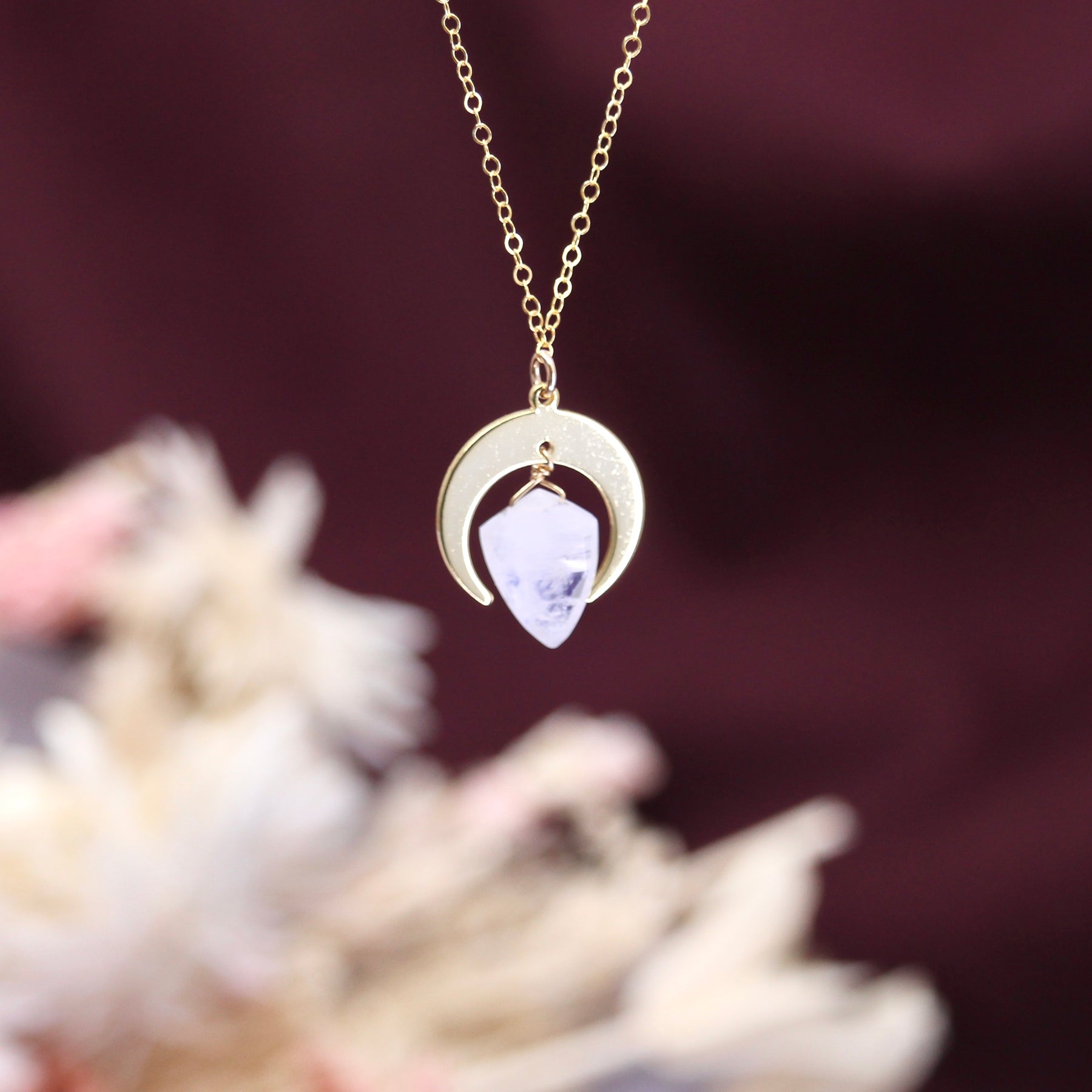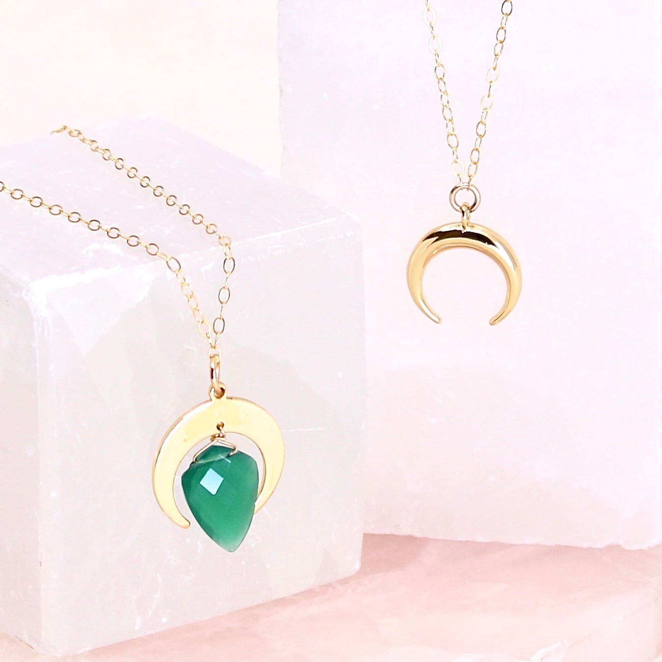 The charm features a crescent moon and cubic zirconia stones overlaid on a sunburst motif within an arch-shaped pendant. The gold plated charm hangs from a perfectly dainty 16" gold filled chain.