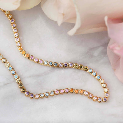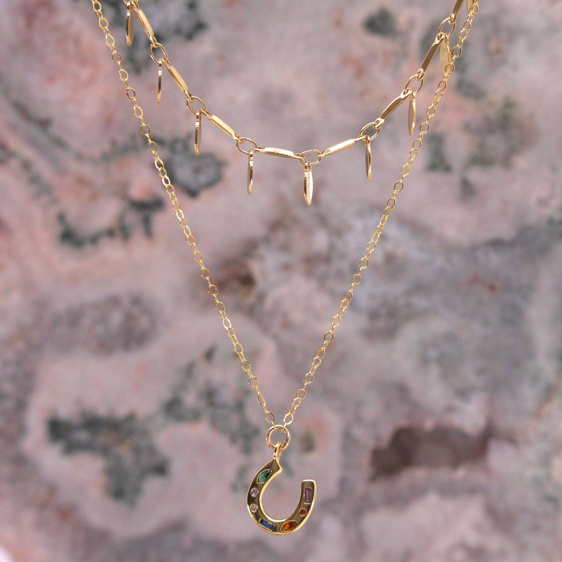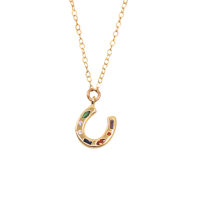 Head west with this Celestial Horseshoe necklace covered in stunning colored cz's. Horseshoes are said to symbolize protection and give good luck to those who possess them. Use this piece for layering or gracefully on it's own.