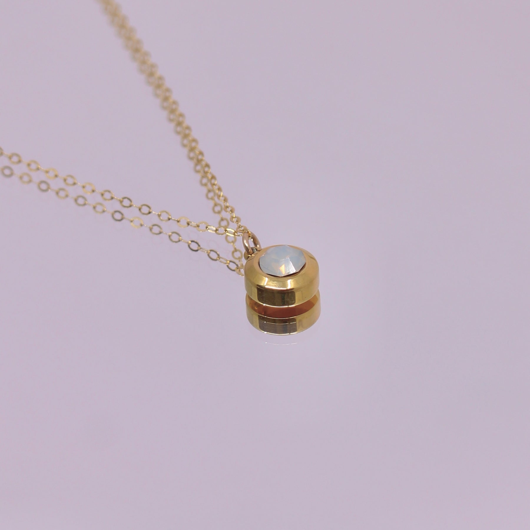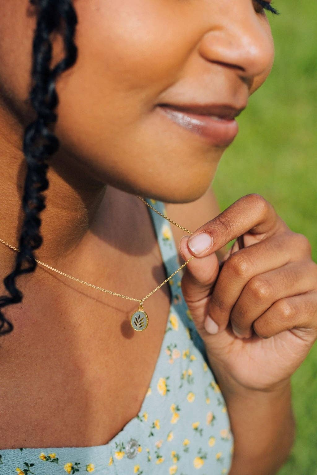 Strung on 14k Goldfill chain, it won't tarnish or change colors, even with daily wear. Our necklace chains also come with an adjustable slider, so it can be worn as short as 16" or as long as 22". The pendant itself is gold plated with an extra layer of tarnish resistance.