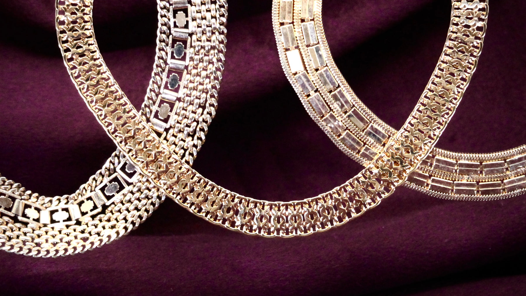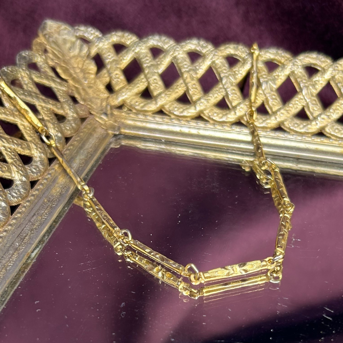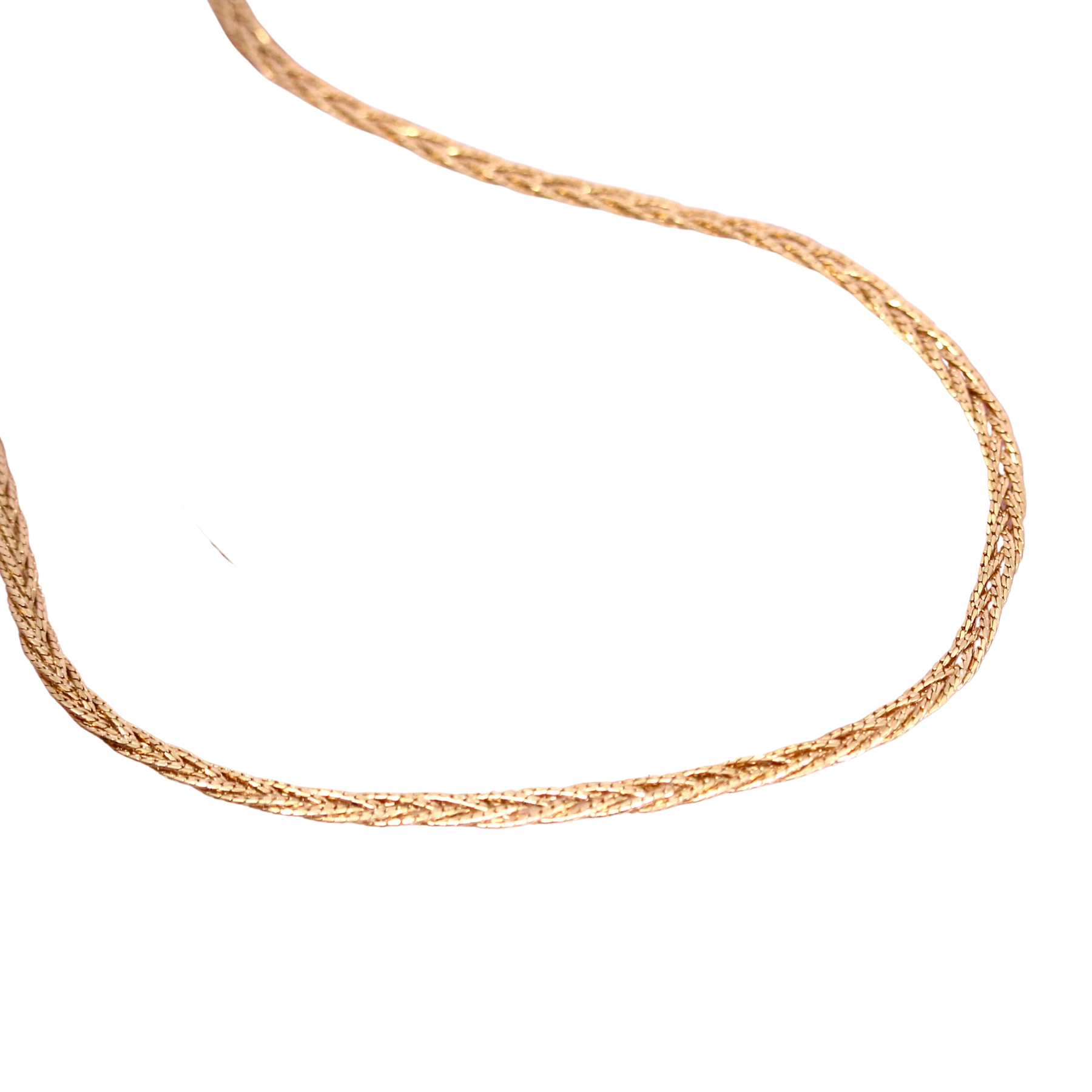 Vintage gold tone flat woven chain with elongated lobster clasp.