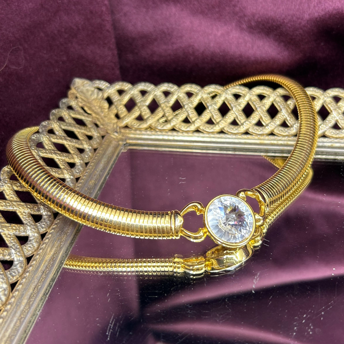Make a bold statement with this vintage omega chain choker, featuring a striking faceted cubic zirconia center that catches the light from every angle. The classic omega link design pairs timeless elegance with contemporary edge, while the choker length sits perfectly at the collarbone for maximum impact. Whether you're dressing up an everyday look or completing a night-out ensemble, this piece delivers serious style credentials without compromise.