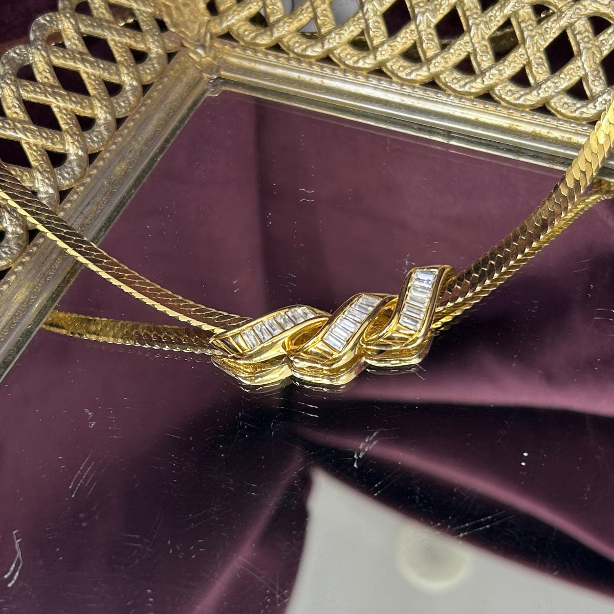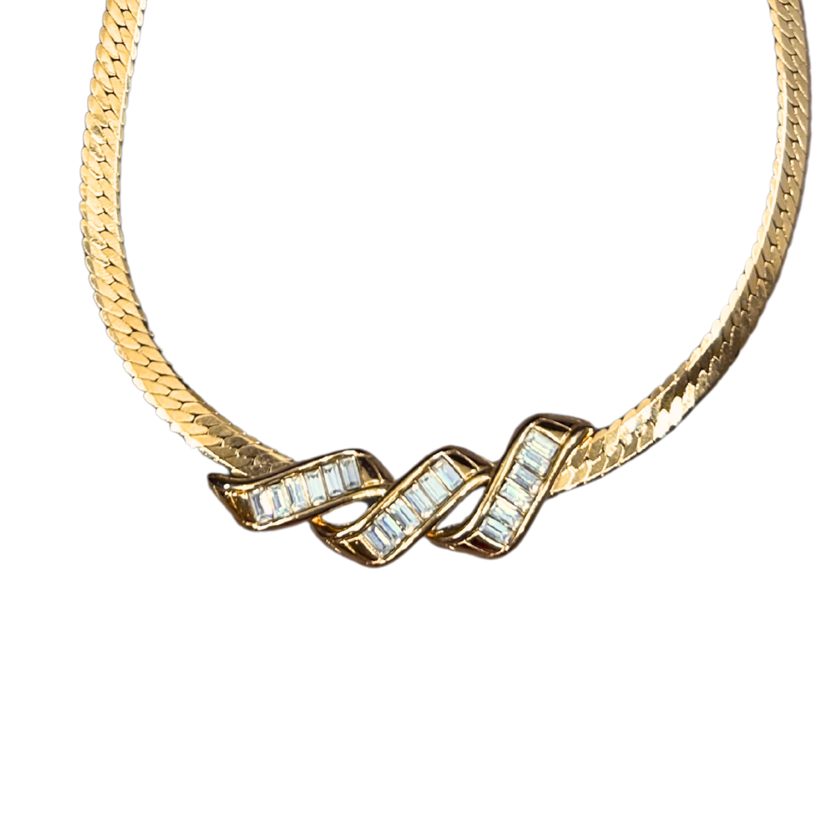 This vintage Parklane necklace brings retro glamour to any look. The herringbone chain flows into a striking wave pendant adorned with baguette rhinestones that catch the light beautifully. Perfect for layering or wearing solo, it's an effortless way to add vintage-inspired sparkle to your everyday style or special occasions.