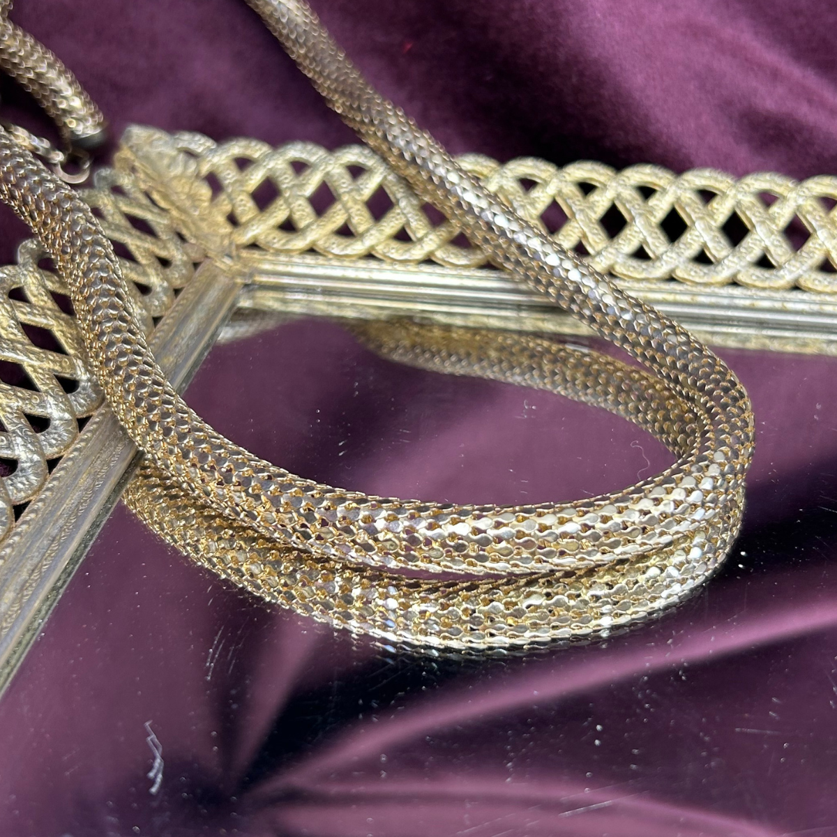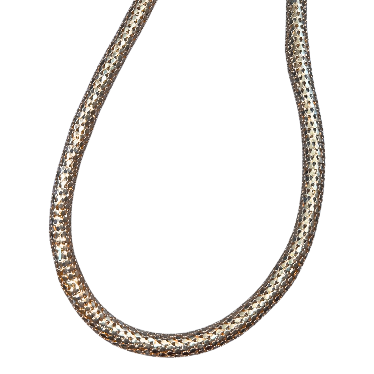 This vintage mesh tube necklace channels retro glamour with its serpent scale design and fluid drape. The delicate tubular construction catches light beautifully, creating dimension and movement with every wear. Perfect for layering or wearing solo, it adds an effortlessly cool edge to any outfit—whether you're dressing up for a night out or elevating your everyday look. A timeless piece that feels both nostalgic and undeniably modern.