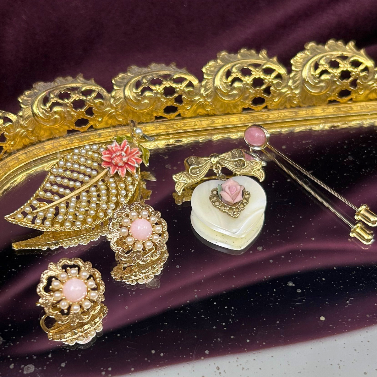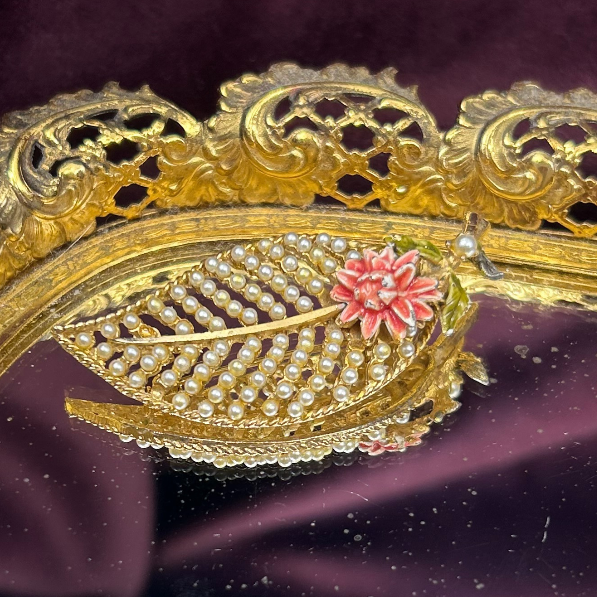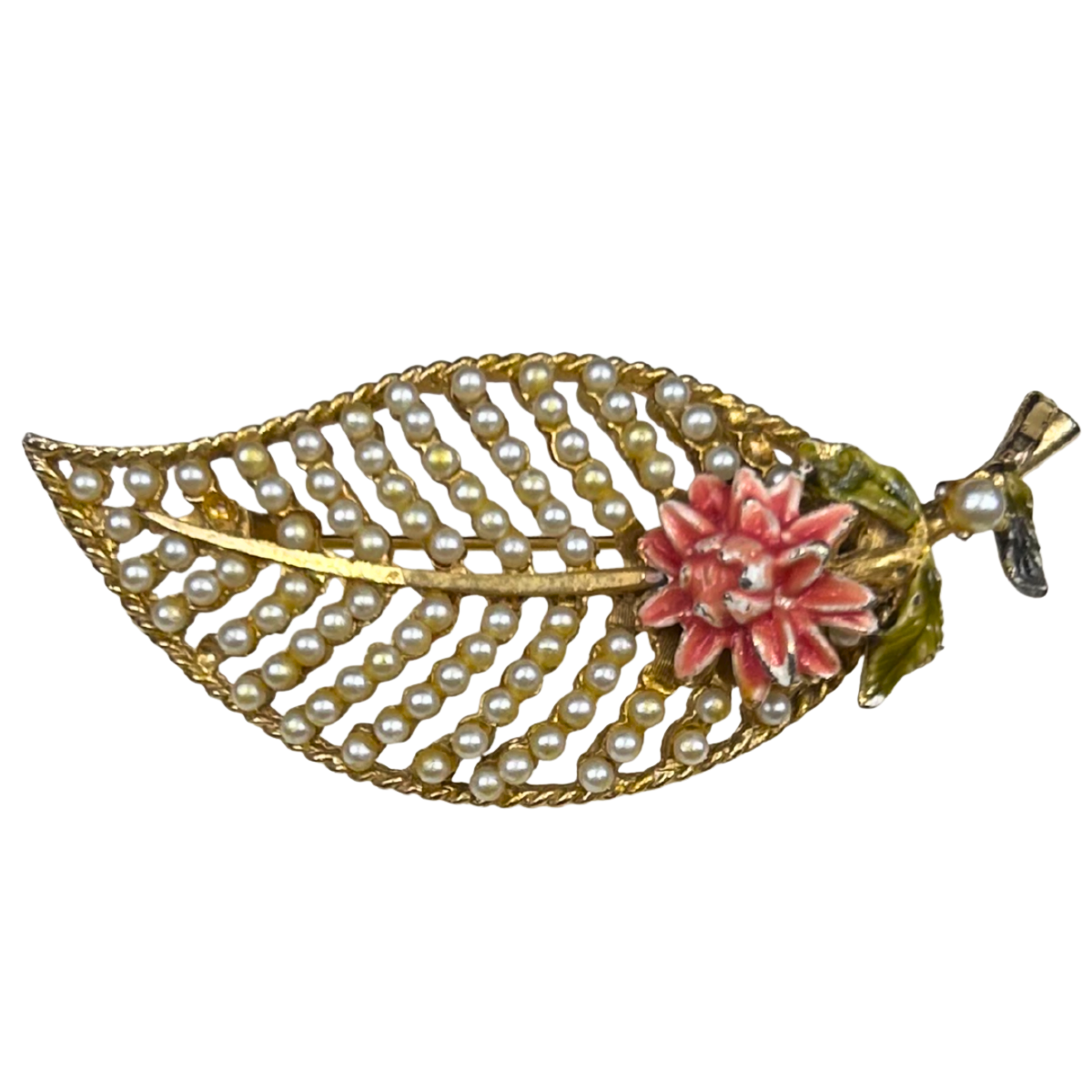 Vintage BSK Leaf and Pearl Brooch with Pink Flower