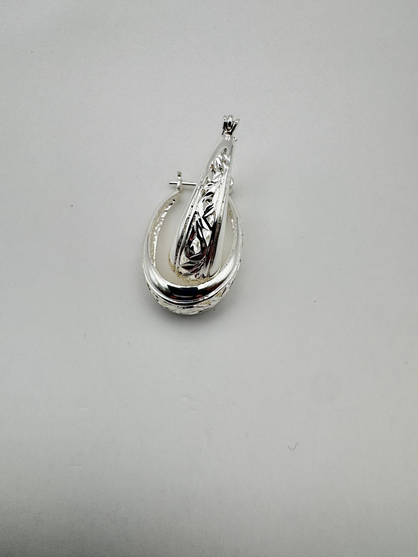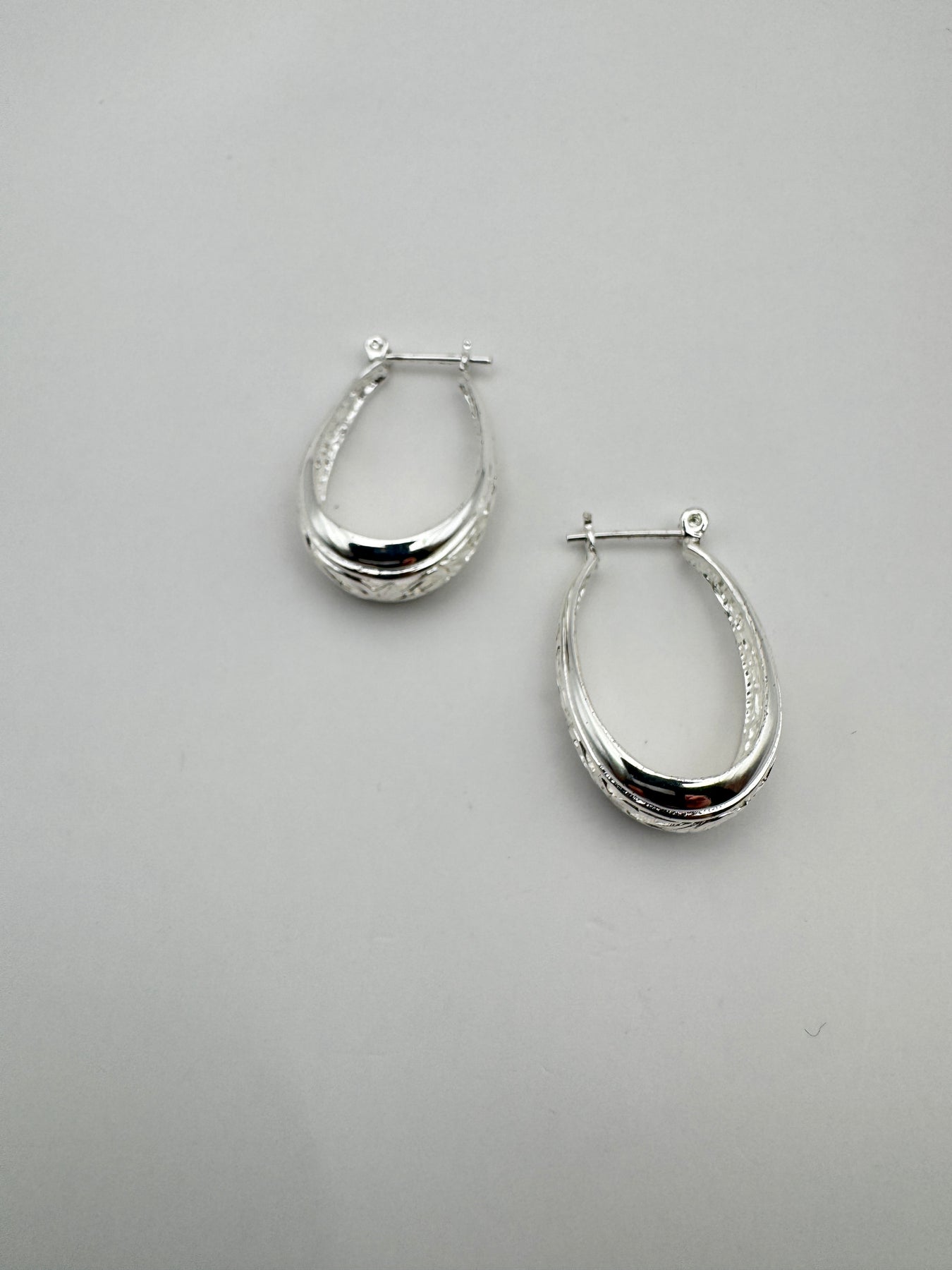 Soft curves and quiet detail give these hoops their character. The sculptural teardrop shape pairs a polished outer arc with delicate filigree engraving, creating depth that catches light as they move. A timeless everyday silhouette with a subtle vintage texture.
