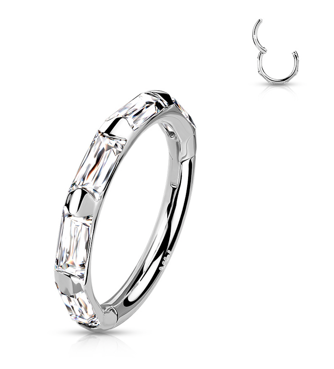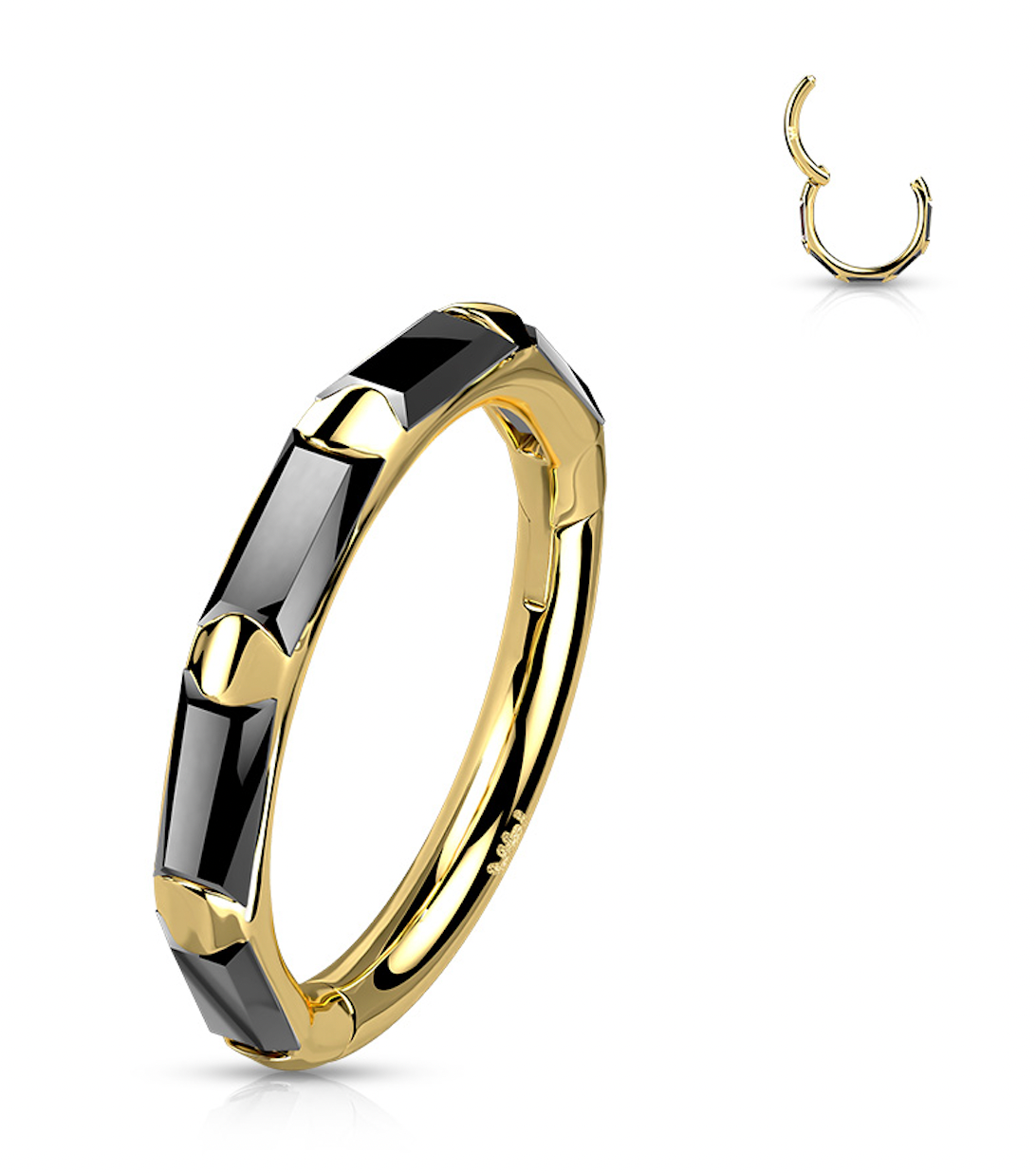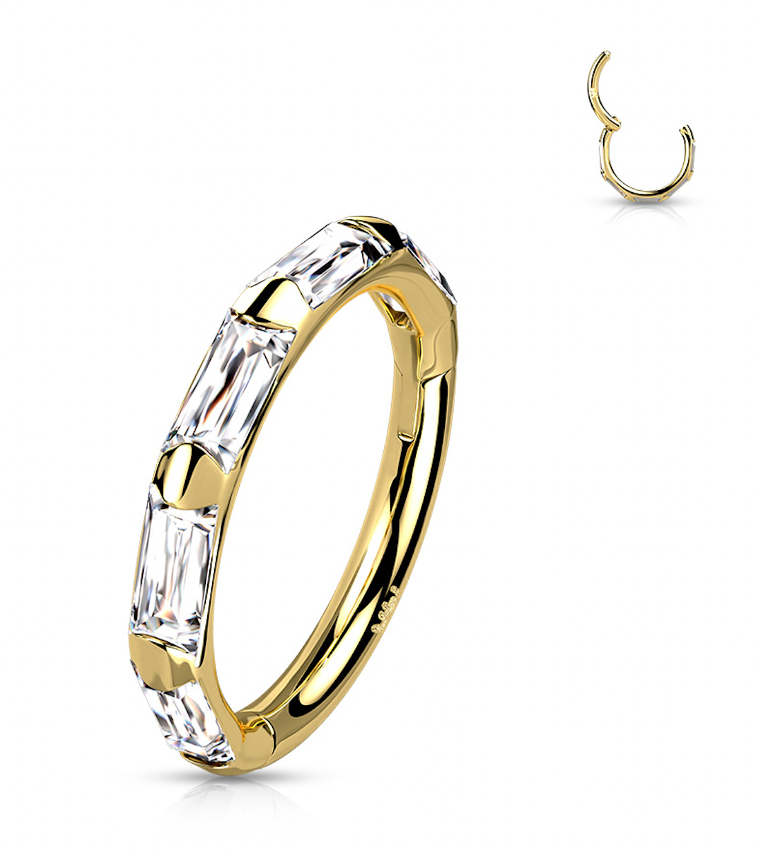 An 8mm three marquis hoop set white CZ stones in 14k gold with a hinged closure for nose, septum, daith and more.