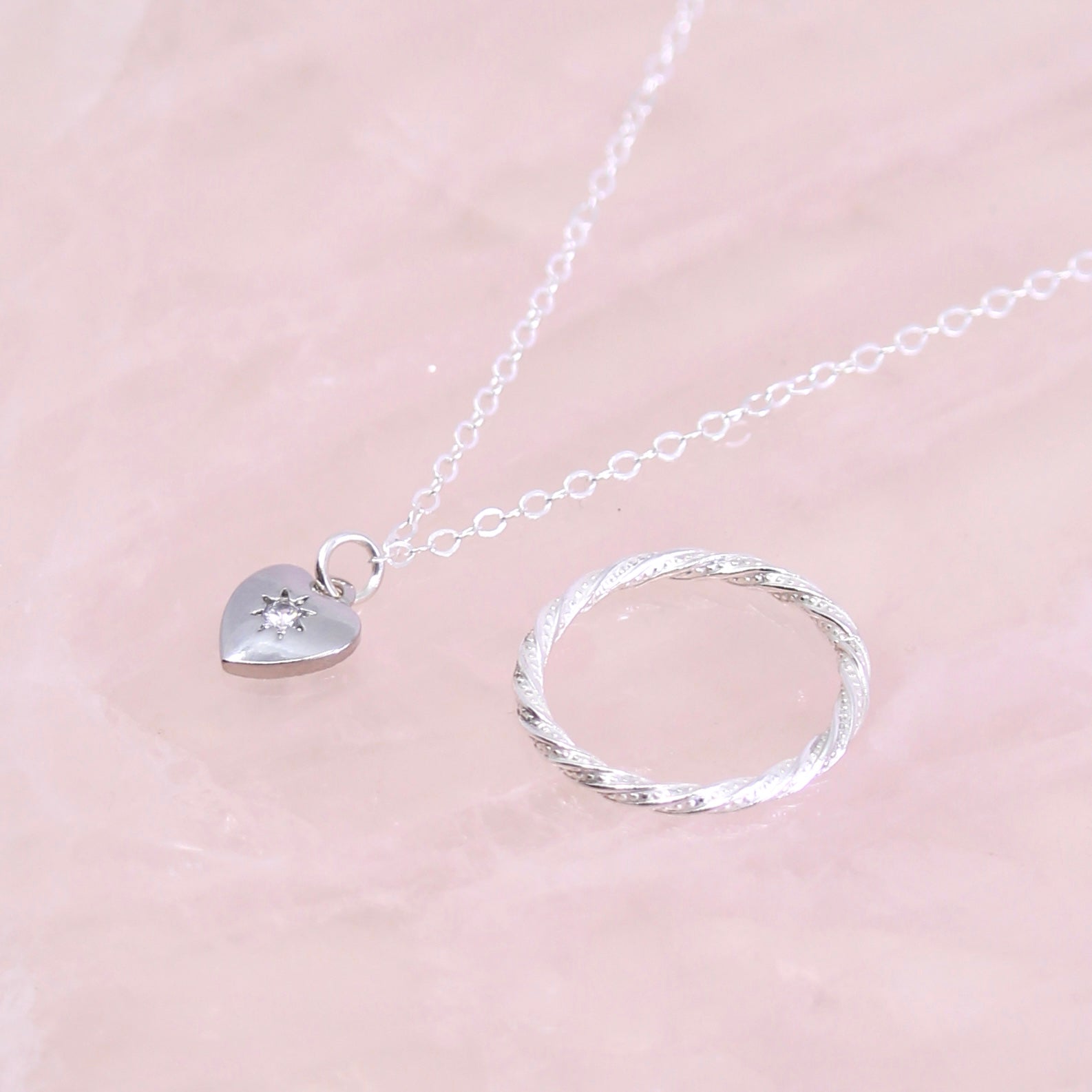 This dainty heart charm has a single star burst set cz in the center, making it shine even brighter.