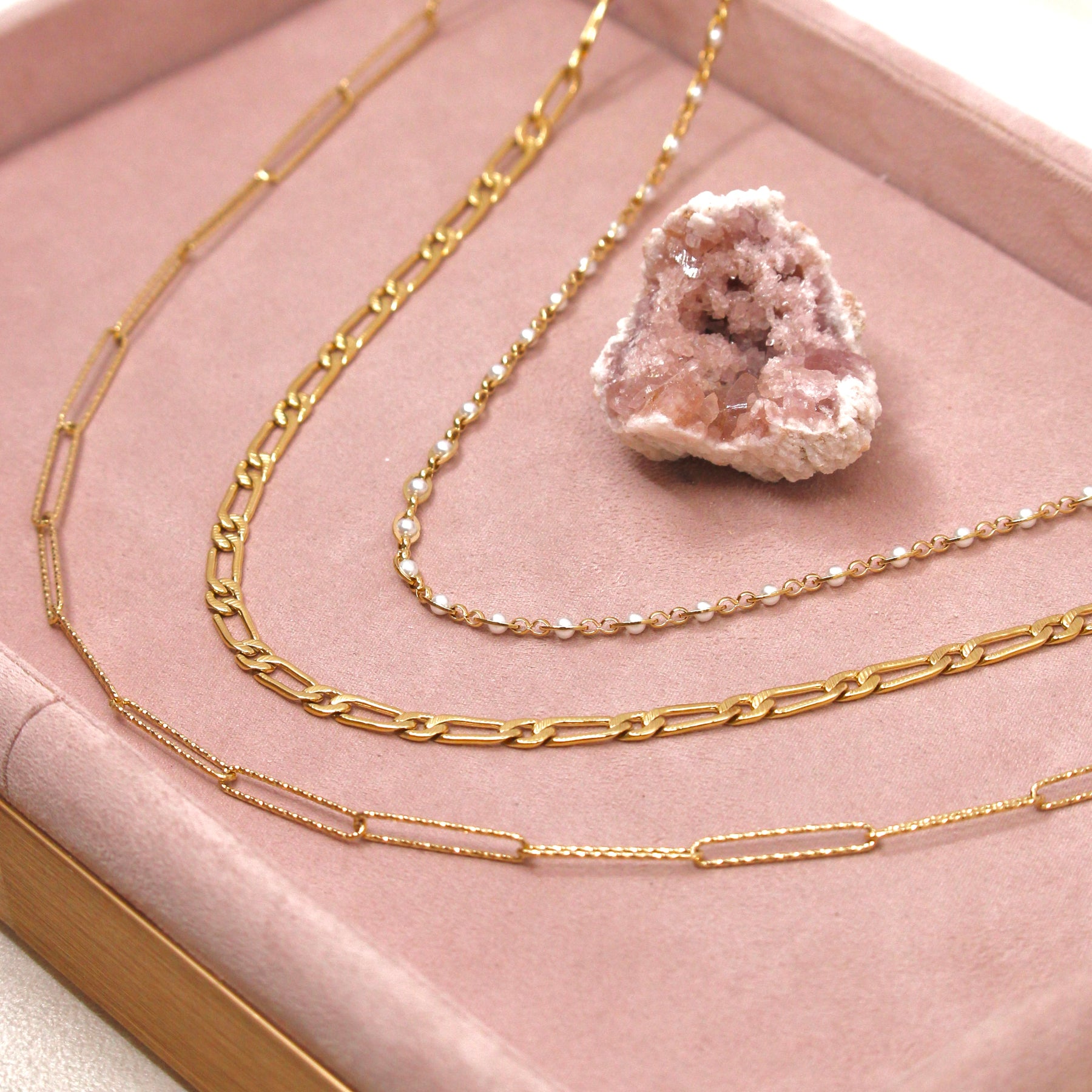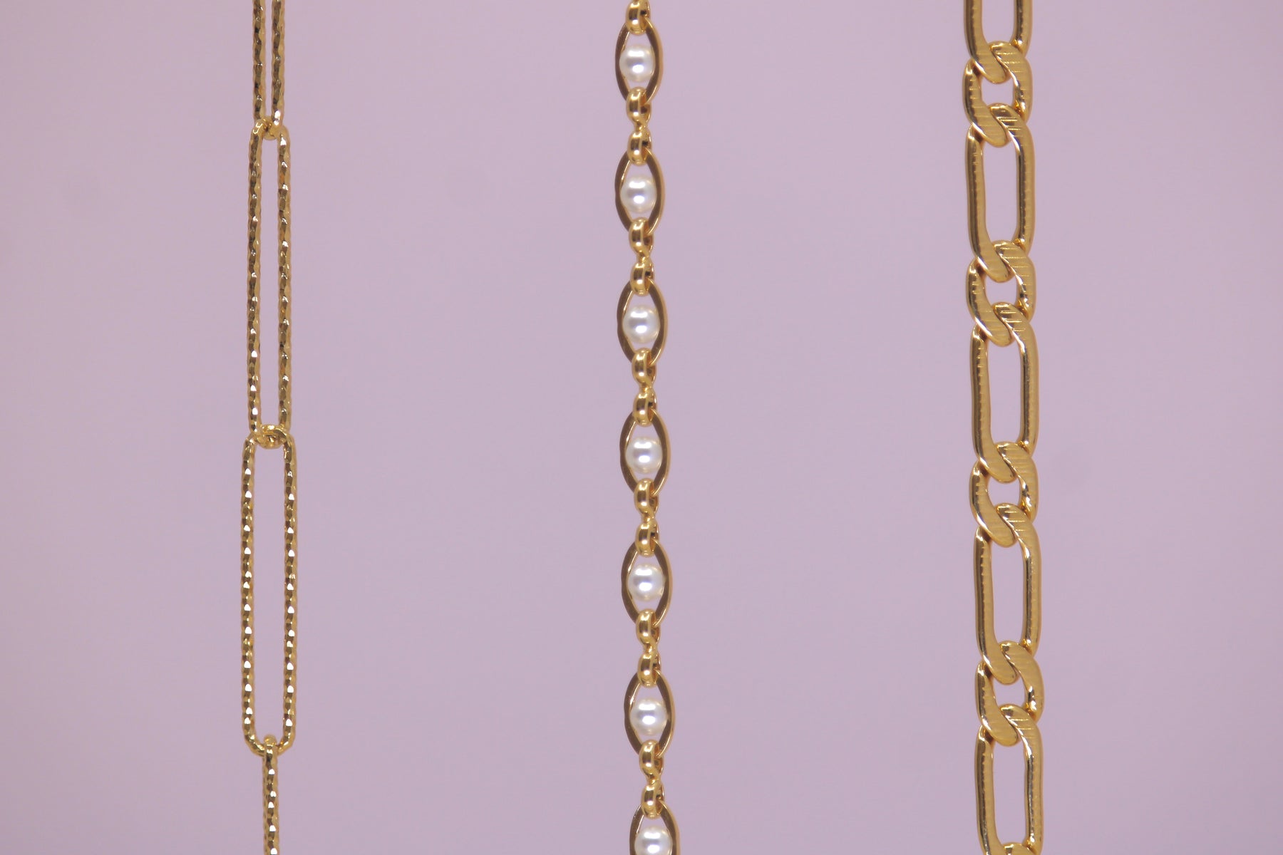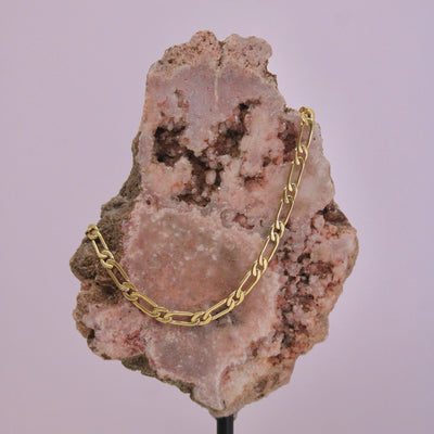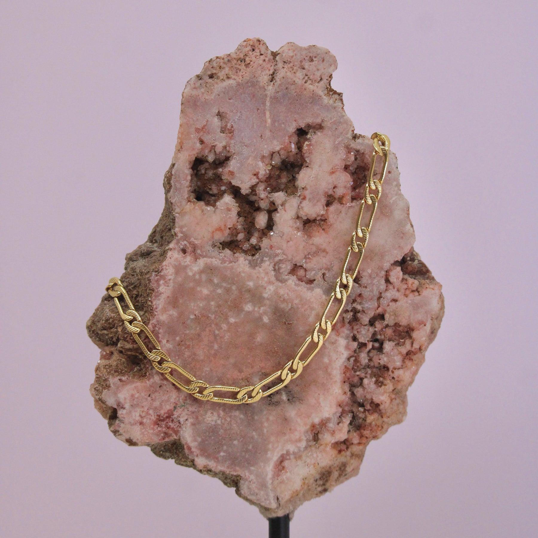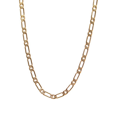 This beautiful textured figaro chain is a great layering piece, with a nice heft to it. Textured lines catch the light and throw a little shine.