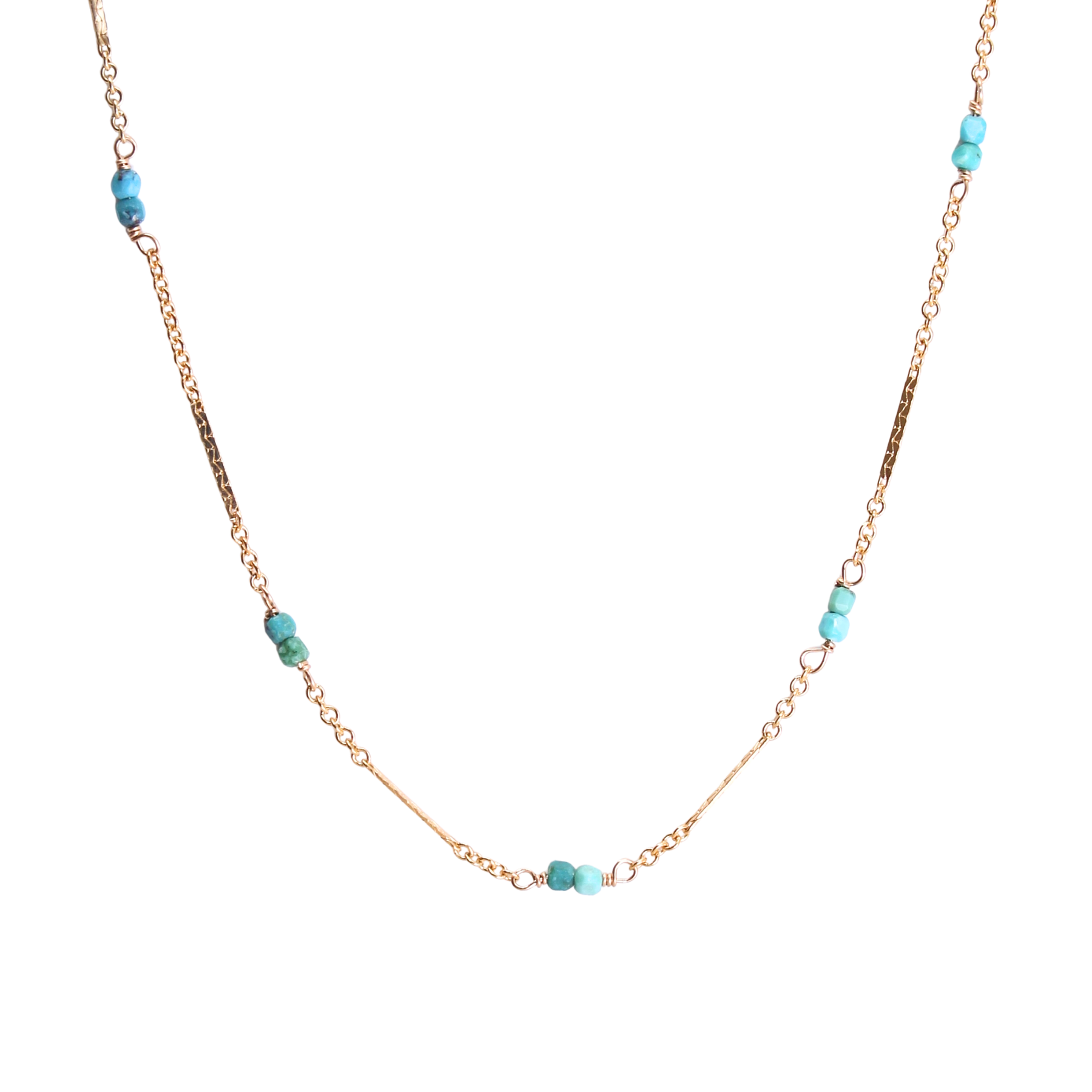 The Mineral and Matter Phobos Turquoise Necklace is named after Mars's irregularly shaped moon, believed to be a captured asteroid.
