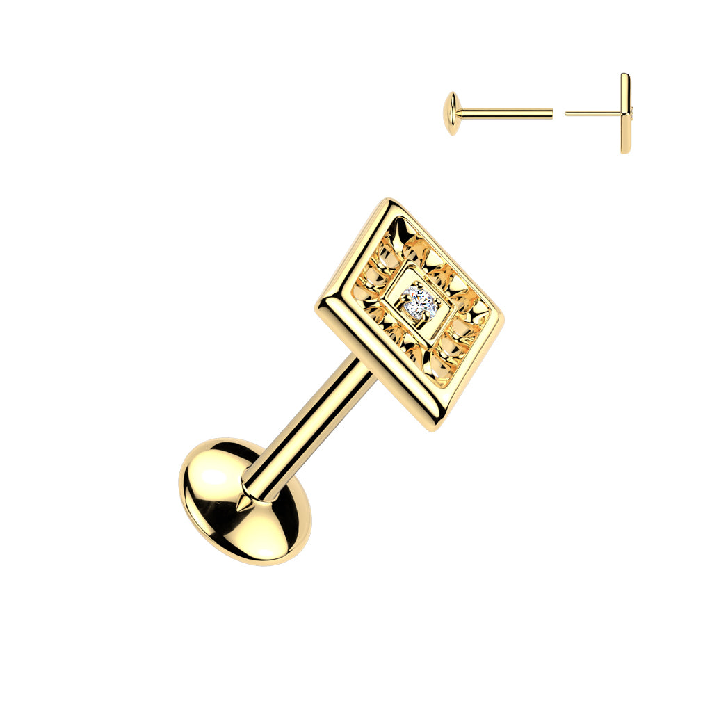 A single rhombus stud with convex details surrounding a diamond cut CZ.